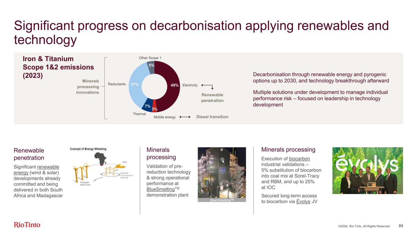 ©2024, Rio Tinto, All Rights Reserved 89 Significant progress on decarbonisation applying renewables and technology Renewable penetration Significant renewable energy (wind & solar) developments already committed and being delivered in both South Africa and Madagascar Decarbonisation through renewable energy and pyrogenic options up to 2030, and technology breakthrough afterward Multiple solutions under development to manage individual performance risk – focused on leadership in technology development Iron & Titanium Scope 1&2 emissions (2023) Minerals processing innovations Renewable penetration Diesel transition 49%37% Electricity 3% Mobile energy 7% Thermal Reductants 5% Other Scope 1 Minerals processing Validation of pre- reduction technology & strong operational performance at BlueSmeltingTM demonstration plant Minerals processing Execution of biocarbon industrial validations – 5% substitution of biocarbon into coal mix at Sorel-Tracy and RBM, and up to 25% at IOC Secured long-term access to biocarbon via Évolys JV