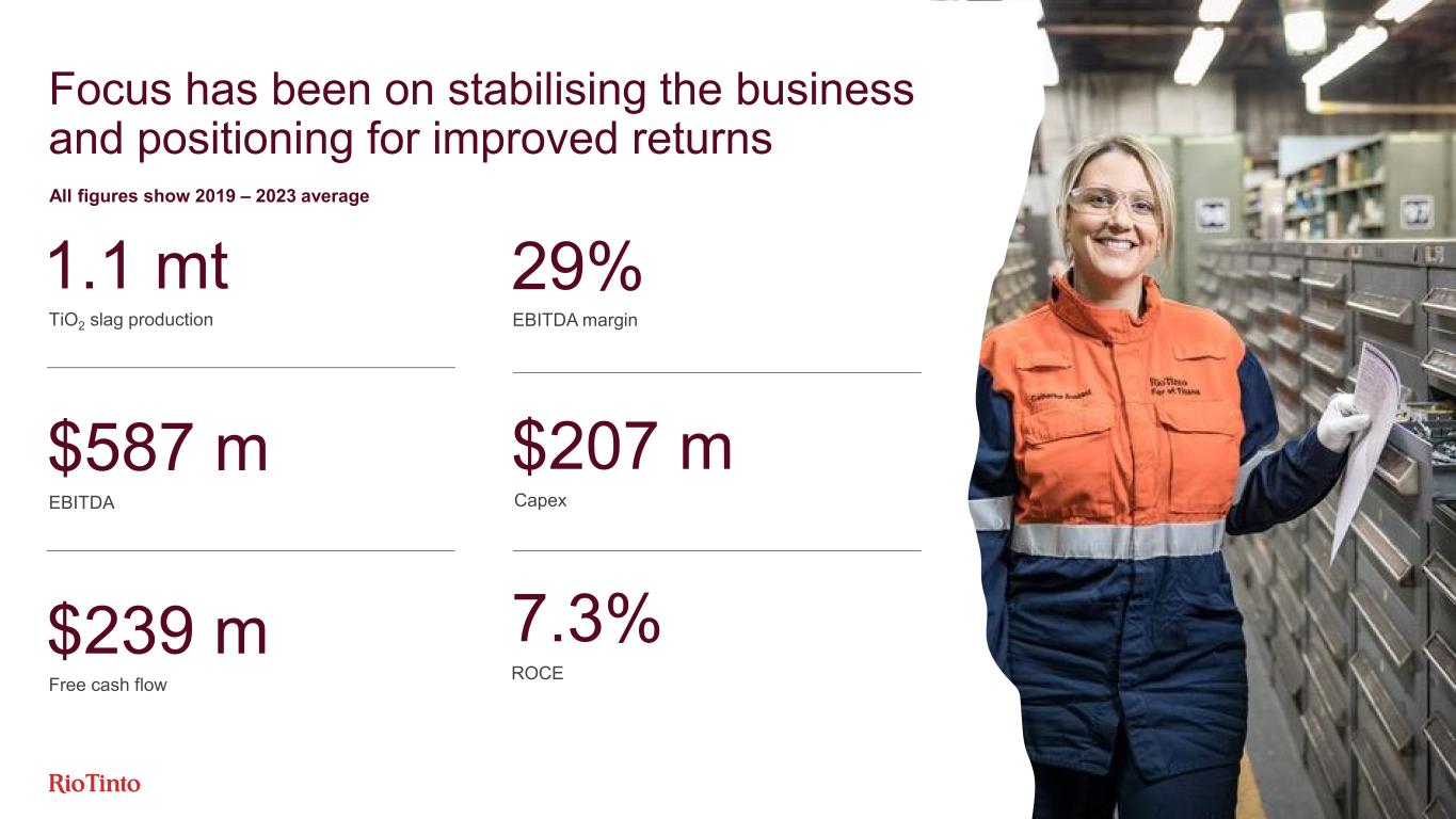 ©2024, Rio Tinto, All Rights Reserved 91 Focus has been on stabilising the business and positioning for improved returns 29% $587 m EBITDA 1.1 mt TiO2 slag production $239 m Free cash flow $207 m Capex EBITDA margin All figures show 2019 – 2023 average 7.3% ROCE