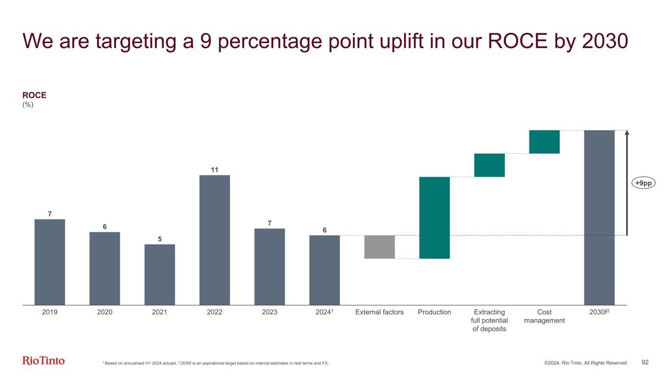 ©2024, Rio Tinto, All Rights Reserved 92 We are targeting a 9 percentage point uplift in our ROCE by 2030 7 6 5 11 7 2019 2020 2021 2022 2023 20241 External factors Production Extracting full potential of deposits Cost management 2030f2 6 +9pp 1 Based on annualised H1 2024 actuals. 2 2030f is an aspirational target based on internal estimates in real terms and FX. ROCE (%)