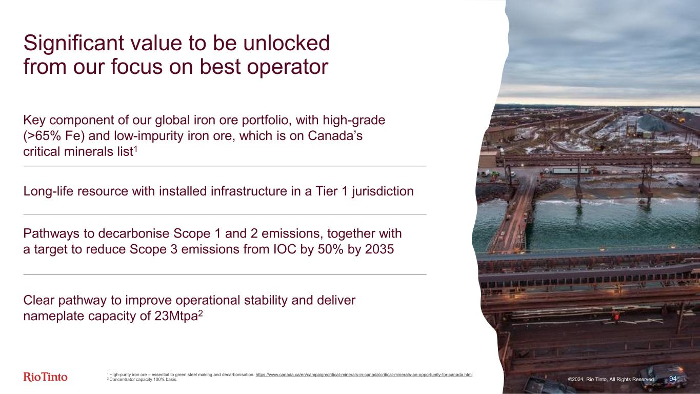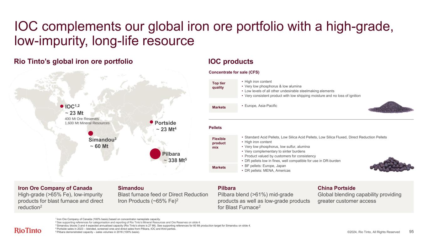 ©2024, Rio Tinto, All Rights Reserved 94 Significant value to be unlocked from our focus on best operator 1 High-purity iron ore – essential to green steel making and decarbonisation. https://www.canada.ca/en/campaign/critical-minerals-in-canada/critical-minerals-an-opportunity-for-canada.html 2 Concentrator capacity 100% basis. Pathways to decarbonise Scope 1 and 2 emissions, together with a target to reduce Scope 3 emissions from IOC by 50% by 2035 Key component of our global iron ore portfolio, with high-grade (>65% Fe) and low-impurity iron ore, which is on Canada’s critical minerals list1 Clear pathway to improve operational stability and deliver nameplate capacity of 23Mtpa2 Long-life resource with installed infrastructure in a Tier 1 jurisdiction