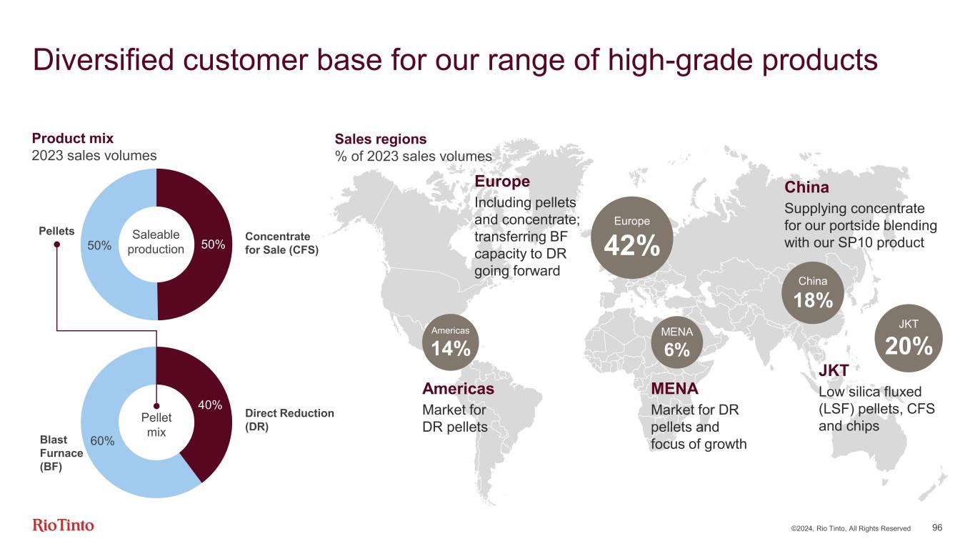 IOC complements our global iron ore portfolio with a high-grade, low-impurity, long-life resource Iron Ore Company of Canada High-grade (>65% Fe), low-impurity products for blast furnace and direct reduction2 Simandou Blast furnace feed or Direct Reduction Iron Products (~65% Fe)2 Pilbara Pilbara blend (>61%) mid-grade products as well as low-grade products for Blast Furnace2 China Portside Global blending capability providing greater customer access Rio Tinto’s global iron ore portfolio 1 Iron Ore Company of Canada (100% basis) based on concentrator nameplate capacity. 2 See supporting references for categorisation and reporting of Rio Tinto’s Mineral Resources and Ore Reserves on slide 4. 3 Simandou blocks 3 and 4 expected annualised capacity (Rio Tinto’s share is 27 Mt). See supporting references for 60 Mt production target for Simandou on slide 4. 4 Portside sales in 2023 – blended, screened ores and direct sales from Pilbara, IOC and third parties. 5 Pilbara demonstrated capacity – sales volumes in 2018 (100% basis). Top tier quality Markets • High iron content • Very low phosphorus & low alumina • Low levels of all other undesirable steelmaking elements • Very consistent product with low shipping moisture and no loss of ignition • Europe, Asia-Pacific Concentrate for sale (CFS) Flexible product mix Markets • Standard Acid Pellets, Low Silica Acid Pellets, Low Silica Fluxed, Direct Reduction Pellets • High iron content • Very low phosphorus, low sulfur, alumina • Very complementary to sinter burdens • Product valued by customers for consistency • DR pellets low in fines, well compatible for use in DR-burden Pellets IOC products • BF pellets: Europe, Japan • DR pellets: MENA, Americas IOC1,2 ~ 23 Mt Simandou3 ~ 60 Mt Portside ~ 23 Mt4 Pilbara ~ 338 Mt5 400 Mt Ore Reserves 1,600 Mt Mineral Resources ©2024, Rio Tinto, All Rights Reserved 95