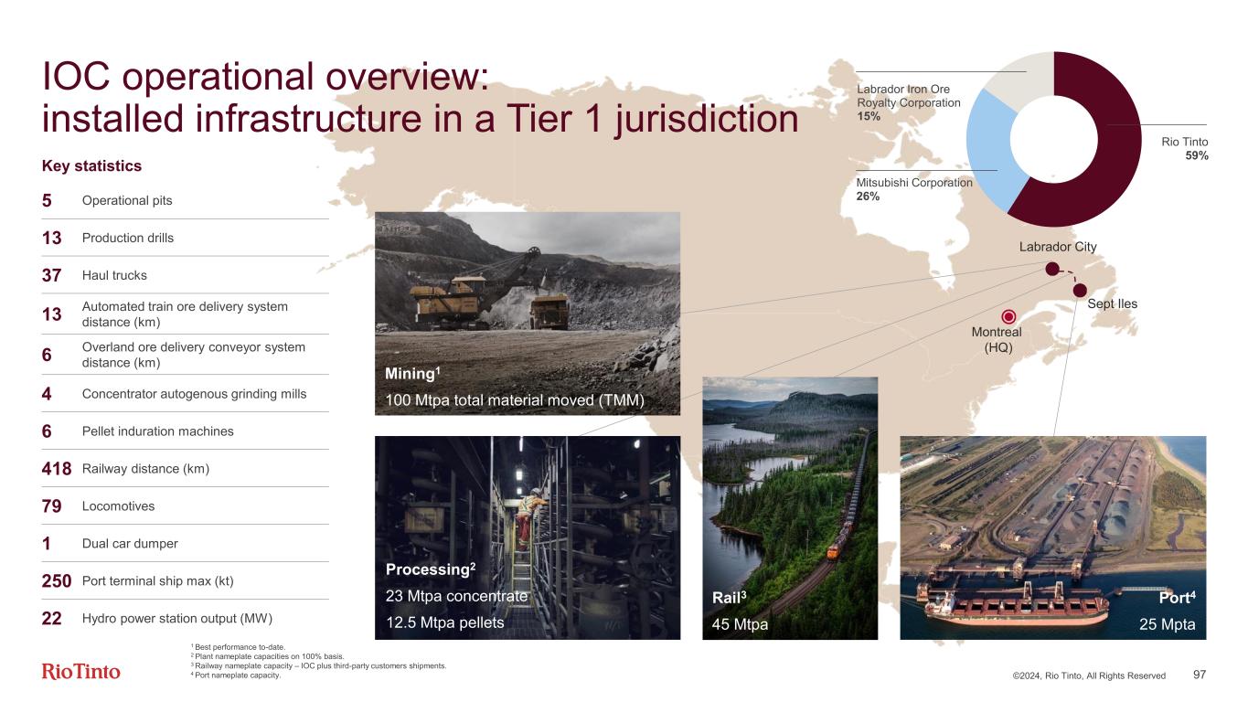 Labrador City Sept Iles Montreal (HQ) Mining1 100 Mtpa total material moved (TMM) Processing2 23 Mtpa concentrate 12.5 Mtpa pellets Rail3 45 Mtpa Port4 25 Mpta Rio Tinto 59% Mitsubishi Corporation 26% Labrador Iron Ore Royalty Corporation 15% 1 Best performance to-date. 2 Plant nameplate capacities on 100% basis. 3 Railway nameplate capacity – IOC plus third-party customers shipments. 4 Port nameplate capacity. 5 Operational pits 13 Production drills 37 Haul trucks 13 Automated train ore delivery system distance (km) 6 Overland ore delivery conveyor system distance (km) 4 Concentrator autogenous grinding mills 6 Pellet induration machines 418 Railway distance (km) 79 Locomotives 1 Dual car dumper 250 Port terminal ship max (kt) 22 Hydro power station output (MW) Key statistics IOC operational overview: installed infrastructure in a Tier 1 jurisdiction ©2024, Rio Tinto, All Rights Reserved 97