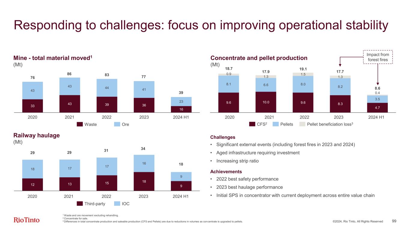 Concentrate and pellet production (Mt) 12 13 15 18 9 18 17 17 16 9 33 43 39 36 16 43 43 44 41 23 9.6 10.0 9.6 8.3 4.7 8.1 6.6 8.0 8.2 3.5 1.3 1.5 1.3 0.4 Responding to challenges: focus on improving operational stability CFS2 Pellets 18.7 17.9 19.1 17.7 8.6 Pellet beneficiation loss3 2020 2021 2022 2023 2024 H1 0.9 Waste Ore 76 86 83 77 39 2020 2021 2022 2023 2024 H1 29 29 31 34 18 2020 2021 2022 2023 2024 H1 1 Waste and ore movement excluding rehandling. 2 Concentrate for sale. 3 Differences in total concentrate production and saleable production (CFS and Pellets) are due to reductions in volumes as concentrate is upgraded to pellets. ©2024, Rio Tinto, All Rights Reserved 99 Mine - total material moved1 (Mt) Railway haulage (Mt) Third-party IOC Challenges • Significant external events (including forest fires in 2023 and 2024) • Aged infrastructure requiring investment • Increasing strip ratio Achievements • 2022 best safety performance • 2023 best haulage performance • Initial SPS in concentrator with current deployment across entire value chain Impact from forest fires