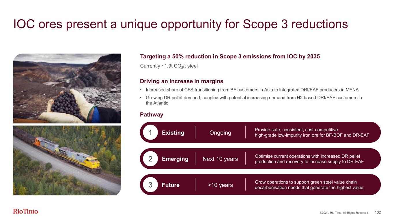 ©2024, Rio Tinto, All Rights Reserved 102 IOC ores present a unique opportunity for Scope 3 reductions Pathway Targeting a 50% reduction in Scope 3 emissions from IOC by 2035 Currently ~1.9t CO2/t steel Driving an increase in margins • Increased share of CFS transitioning from BF customers in Asia to integrated DRI/EAF producers in MENA • Growing DR pellet demand, coupled with potential increasing demand from H2 based DRI/EAF customers in the Atlantic 1 Existing 2 3 Provide safe, consistent, cost-competitive high-grade low-impurity iron ore for BF-BOF and DR-EAF Optimise current operations with increased DR pellet production and recovery to increase supply to DR-EAF Grow operations to support green steel value chain decarbonisation needs that generate the highest value Ongoing Emerging Next 10 years Future >10 years