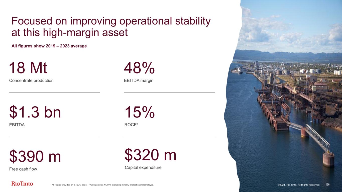 ©2024, Rio Tinto, All Rights Reserved 104 Focused on improving operational stability at this high-margin asset All figures show 2019 – 2023 average 48% EBITDA margin 15% ROCE1 $1.3 bn EBITDA 18 Mt Concentrate production $390 m Free cash flow $320 m Capital expenditure All figures provided on a 100% basis. | 1 Calculated as NOPAT excluding minority interest/capital employed.