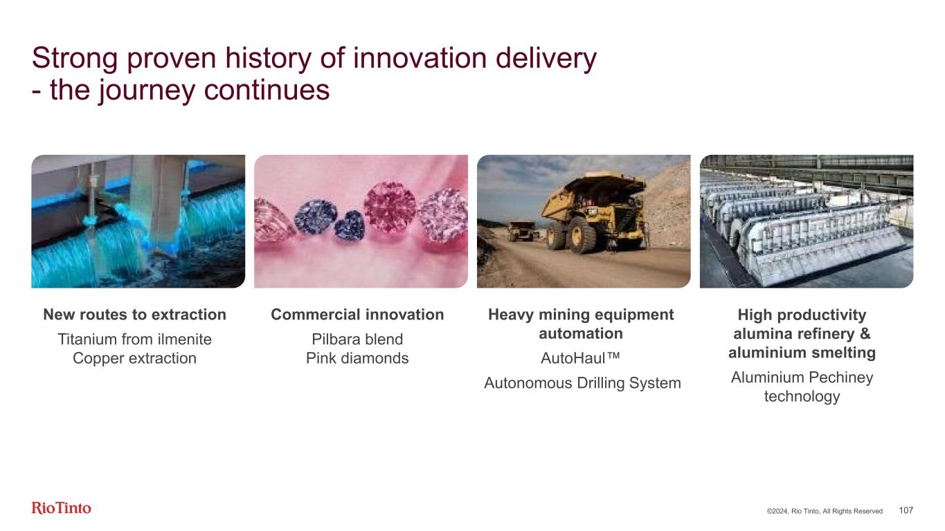©2024, Rio Tinto, All Rights Reserved 107 Strong proven history of innovation delivery - the journey continues New routes to extraction Titanium from ilmenite Copper extraction Commercial innovation Pilbara blend Pink diamonds Heavy mining equipment automation AutoHaul Autonomous Drilling System High productivity alumina refinery & aluminium smelting Aluminium Pechiney technology