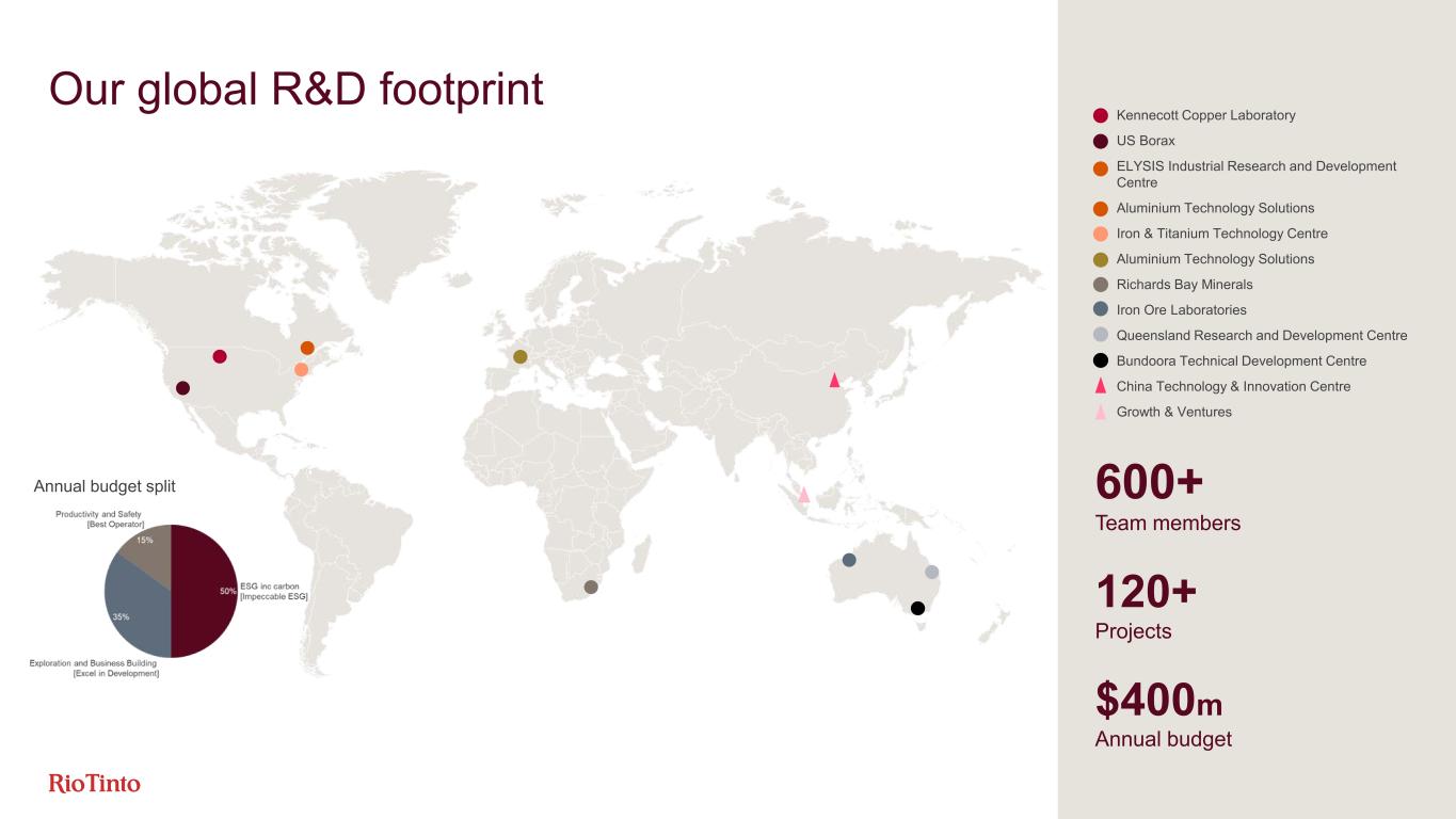 ©2024, Rio Tinto, All Rights Reserved 108 Our global R&D footprint 600+ Team members 120+ Projects $400m Annual budget Kennecott Copper Laboratory US Borax ELYSIS Industrial Research and Development Centre Aluminium Technology Solutions Iron & Titanium Technology Centre Aluminium Technology Solutions Richards Bay Minerals Iron Ore Laboratories Queensland Research and Development Centre Bundoora Technical Development Centre China Technology & Innovation Centre Growth & Ventures Annual budget split