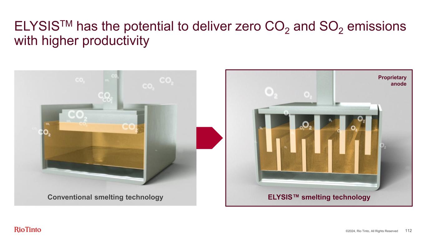 ©2024, Rio Tinto, All Rights Reserved 112 ELYSISTM has the potential to deliver zero CO2 and SO2 emissions with higher productivity Conventional smelting technology ELYSIS smelting technology Proprietary anode