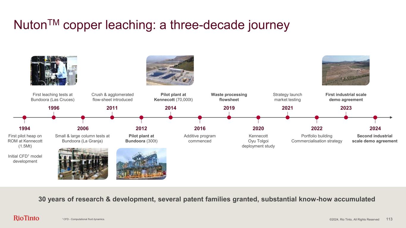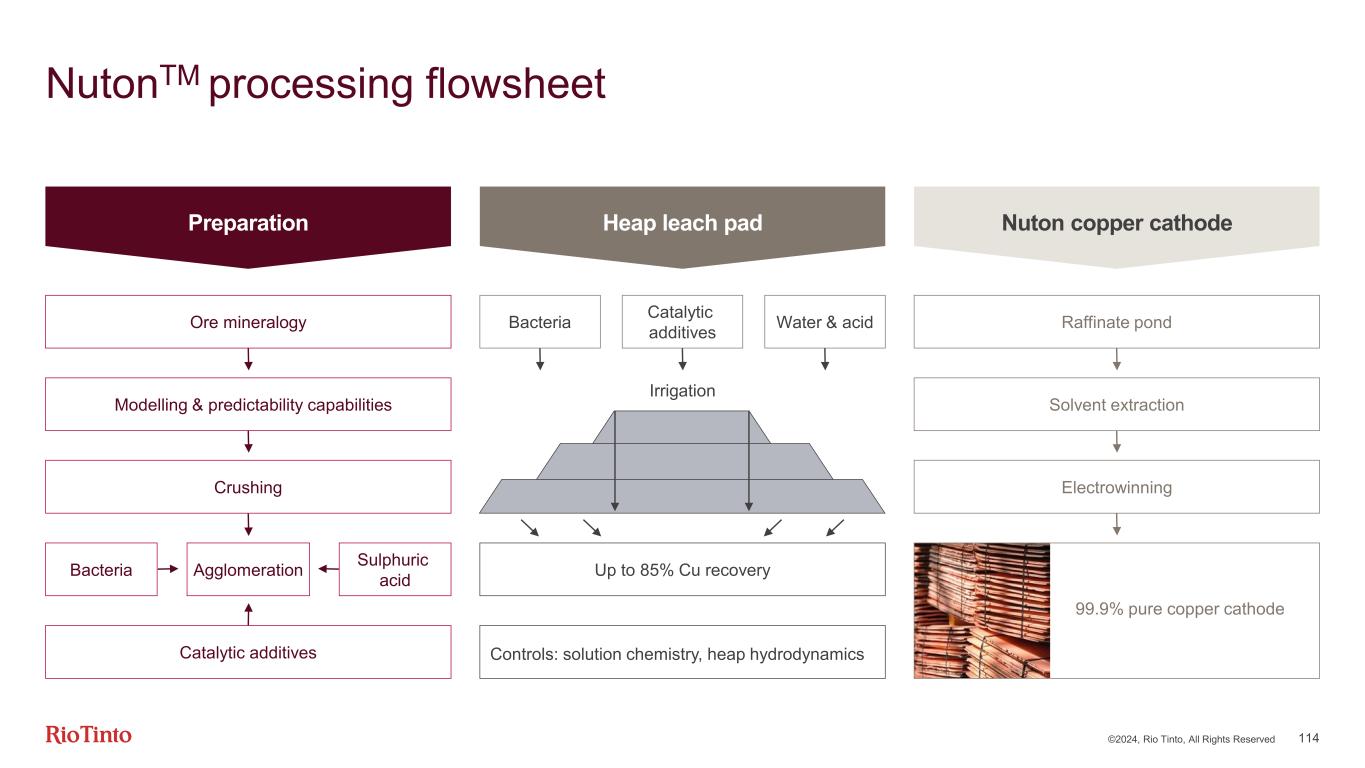 ©2024, Rio Tinto, All Rights Reserved 113 NutonTM copper leaching: a three-decade journey 1996 2006 2011 2012 2014 2016 2019 2020 2021 20221994 2023 2024 First pilot heap on ROM at Kennecott (1.5Mt) Initial CFD1 model development First leaching tests at Bundoora (Las Cruces) Small & large column tests at Bundoora (La Granja) Crush & agglomerated flow-sheet introduced Pilot plant at Bundoora (300t) Pilot plant at Kennecott (70,000t) Additive program commenced Waste processing flowsheet Kennecott Oyu Tolgoi deployment study Strategy launch market testing Portfolio building Commercialisation strategy First industrial scale demo agreement Second industrial scale demo agreement 30 years of research & development, several patent families granted, substantial know-how accumulated 1 CFD - Computational fluid dynamics.