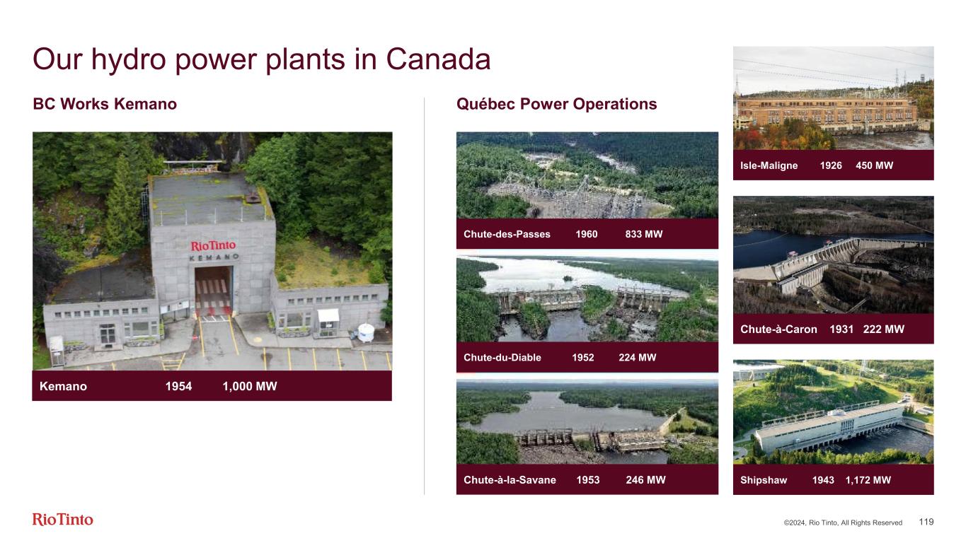 Chute-à-Caron 1931 222 MW ©2024, Rio Tinto, All Rights Reserved 119 Our hydro power plants in Canada Shipshaw 1943 1,172 MW Chute-du-Diable 1952 224 MW Chute-à-la-Savane 1953 246 MW Chute-des-Passes 1960 833 MW Isle-Maligne 1926 450 MW Québec Power OperationsBC Works Kemano Kemano 1954 1,000 MW