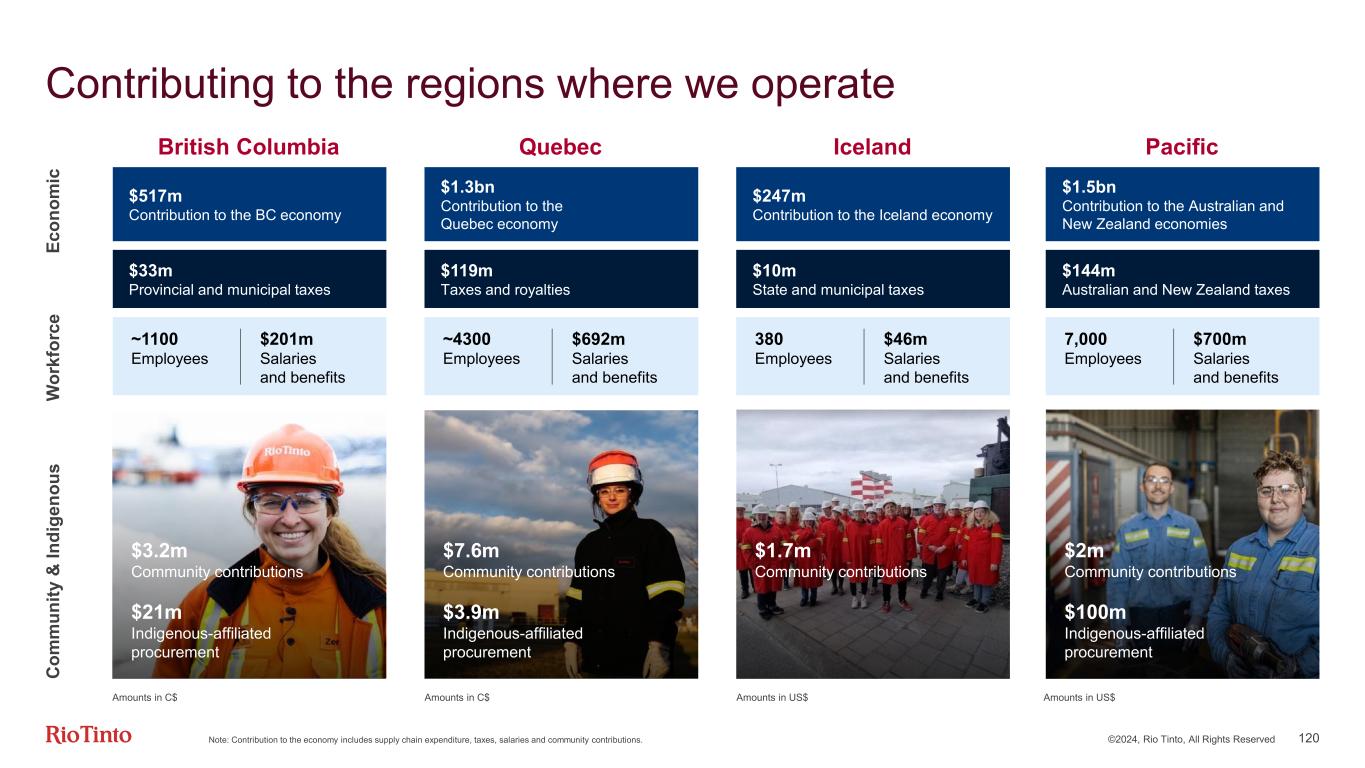 Ec on om ic C om m un ity & In di ge no us $2m Community contributions $100m Indigenous-affiliated procurement Amounts in C$ Amounts in C$ Amounts in US$ Amounts in US$ W or kf or ce $144m Australian and New Zealand taxes Pacific 7,000 Employees $700m Salaries and benefits $1.5bn Contribution to the Australian and New Zealand economies $517m Contribution to the BC economy $33m Provincial and municipal taxes British Columbia ~1100 Employees $201m Salaries and benefits $247m Contribution to the Iceland economy $10m State and municipal taxes Iceland 380 Employees $46m Salaries and benefits Quebec $1.3bn Contribution to the Quebec economy $119m Taxes and royalties ~4300 Employees $692m Salaries and benefits ©2024, Rio Tinto, All Rights Reserved 120 Contributing to the regions where we operate Note: Contribution to the economy includes supply chain expenditure, taxes, salaries and community contributions. $3.2m Community contributions $21m Indigenous-affiliated procurement $1.7m Community contributions $7.6m Community contributions $3.9m Indigenous-affiliated procurement