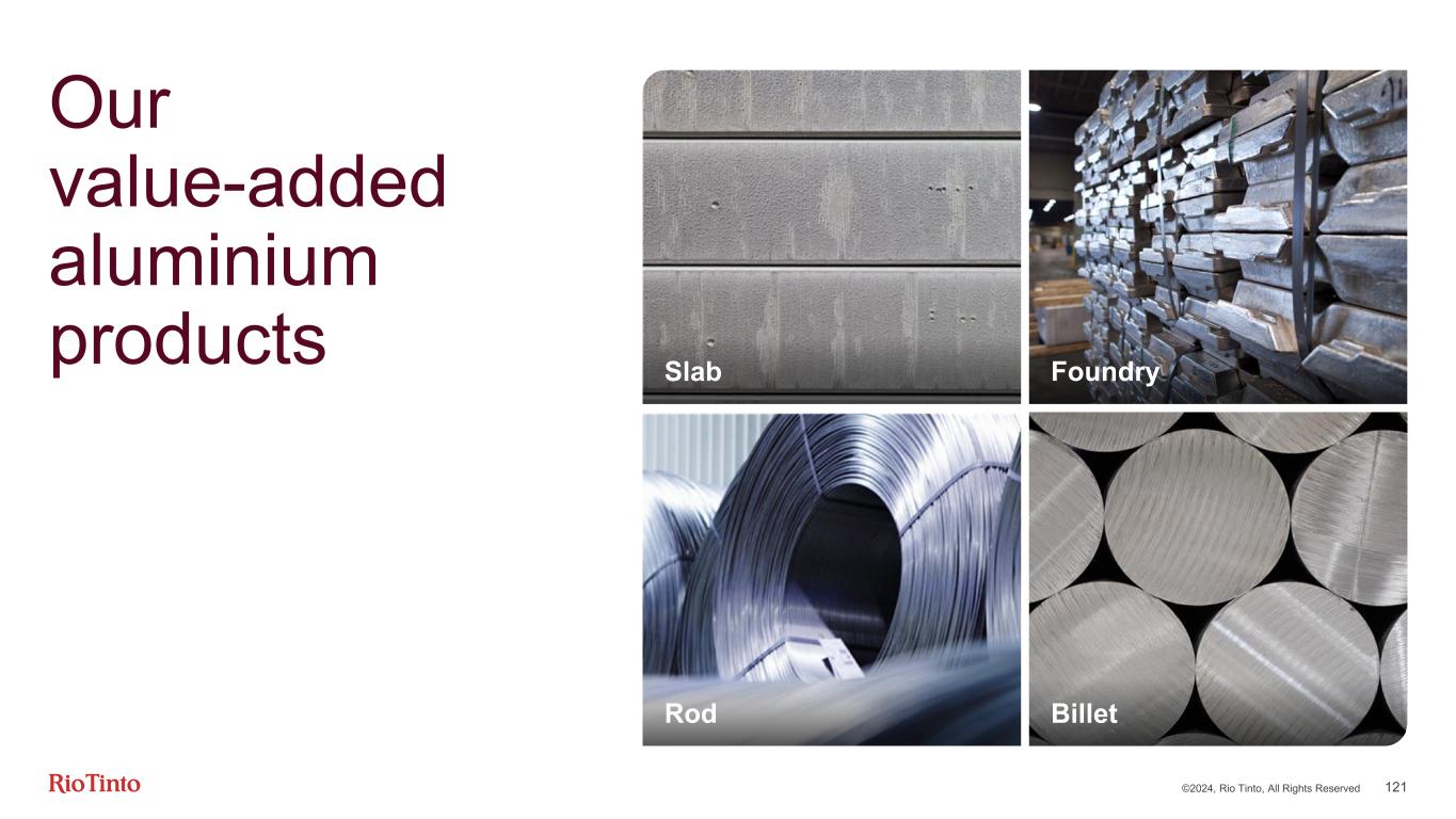 ©2024, Rio Tinto, All Rights Reserved 121 Our value-added aluminium products Slab Foundry Rod Billet