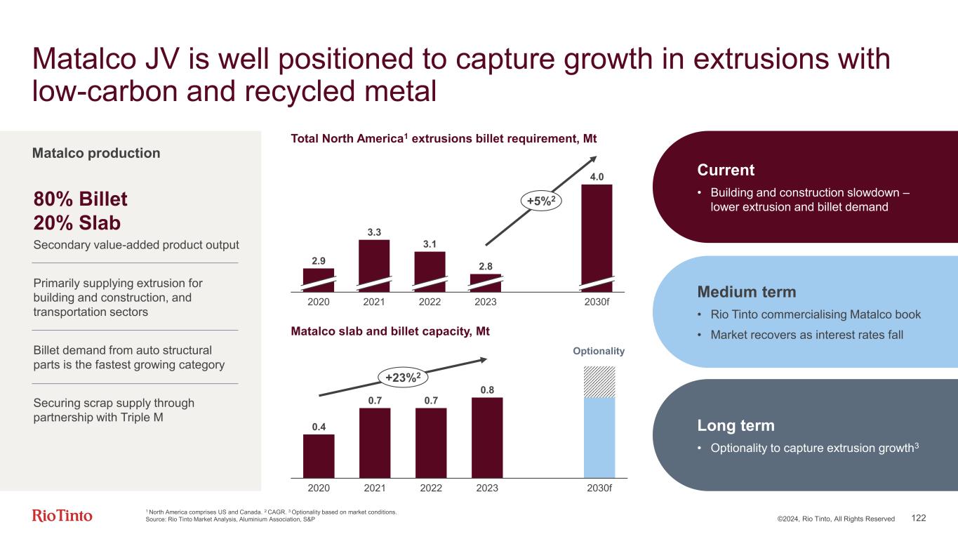 ©2024, Rio Tinto, All Rights Reserved 122 Matalco JV is well positioned to capture growth in extrusions with low-carbon and recycled metal Current • Building and construction slowdown – lower extrusion and billet demand80% Billet 20% Slab Secondary value-added product output Primarily supplying extrusion for building and construction, and transportation sectors Billet demand from auto structural parts is the fastest growing category Securing scrap supply through partnership with Triple M Matalco production Optionality Total North America1 extrusions billet requirement, Mt Matalco slab and billet capacity, Mt 2020 2021 2022 2023 2030f 2.9 3.3 3.1 2.8 4.0 +5%2 2020 2021 2022 2023 2030f 0.4 0.7 0.7 0.8 +23%2 1 North America comprises US and Canada. 2 CAGR. 3 Optionality based on market conditions. Source: Rio Tinto Market Analysis, Aluminium Association, S&P Medium term • Rio Tinto commercialising Matalco book • Market recovers as interest rates fall Long term • Optionality to capture extrusion growth3