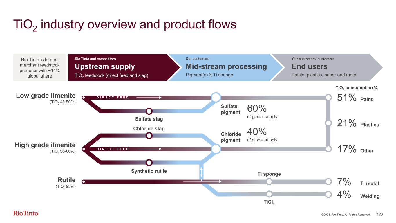 ©2024, Rio Tinto, All Rights Reserved 123 TiO2 industry overview and product flows Low grade ilmenite (TiO2 45-50%) Rutile (TiO2 95%) High grade ilmenite (TiO2 50-60%) Sulfate slag Chloride slag Synthetic rutile Sulfate pigment D I R E C T F E E D Chloride pigment D I R E C T F E E D Other17% Plastics21% Paint51% Ti metal7% Ti sponge TiCl4 60% of global supply 40% of global supply Welding4% TiO2 consumption % Rio Tinto is largest merchant feedstock producer with ~14% global share Upstream supply TiO2 feedstock (direct feed and slag) End users Paints, plastics, paper and metal Mid-stream processing Pigment(s) & Ti sponge Rio Tinto and competitors Our customers Our customers’ customers