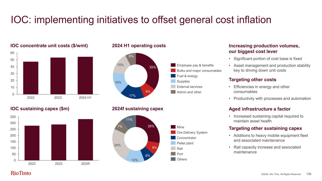 ©2024, Rio Tinto, All Rights Reserved 126 IOC: implementing initiatives to offset general cost inflation 0 10 20 30 40 50 60 2022 2023 2024 H1 35% 9% 17% 16% 15% 8% Employee pay & benefits Bulks and major consumables Fuel & energy Supplies External services Admin and other 0 50 100 150 200 250 300 350 2022 2023 2024f 28% 9% 8% 14% 24% 7% 11% Mine Ore Delivery System Concentrator Pellet plant Rail Port Others IOC concentrate unit costs ($/wmt) IOC sustaining capex ($m) 2024 H1 operating costs 2024f sustaining capex Increasing production volumes, our biggest cost lever • Significant portion of cost base is fixed • Asset management and production stability key to driving down unit costs Targeting other costs • Efficiencies in energy and other consumables • Productivity with processes and automation Aged infrastructure a factor • Increased sustaining capital required to maintain asset health Targeting other sustaining capex • Additions to heavy mobile equipment fleet and associated maintenance • Rail capacity increase and associated maintenance