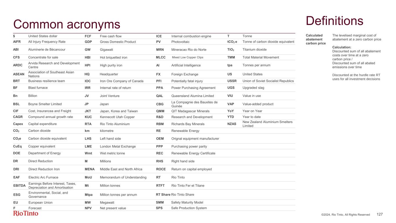 ©2024, Rio Tinto, All Rights Reserved 127 Common acronyms $ United States dollar FCF Free cash flow ICE Internal combustion engine T Tonne Calculated abatement carbon price The levelised marginal cost of abatement at a zero carbon price Calculation: Discounted sum of all abatement costs over time at a zero carbon price / Discounted sum of all abated emissions over time Discounted at the hurdle rate RT uses for all investment decisions AIFR All Injury Frequency Rate GDP Gross Domestic Product PV Photovoltaic tCO2 e Tonne of carbon dioxide equivalent ABI Aluminerie de Bécancour GW Gigawatt MRN Mineracao Rio do Norte TiO2 Titanium dioxide CFS Concentrate for sale HBI Hot briquetted iron MLCC Mixed Low Copper Clips TMM Total Material Movement ARDC Arvida Research and Development Centre HPI High purity iron AI Artificial Intelligence tpa Tonnes per annum ASEAN Association of Southeast Asian Nations HQ Headquarter FX Foreign Exchange US United States BRT Business resilience team IOC Iron Ore Company of Canada PFI Potentially fatal injury USSR Union of Soviet Socialist Republics BF Blast furnace IRR Internal rate of return PPA Power Purchasing Agreement UGS Upgraded slag Bn Billion JV Joint Venture QAL Queensland Alumina Limited VIU Value in use BSL Boyne Smelter Limited JP Japan CBG La Compagnie des Bauxites de Guinée VAP Value-added product CIF Cost, Insurancea and Freight JKT Japan, Korea and Taiwan QMM QIT Madagascar Minerals YoY Year on Year CAGR Compound annual growth rate KUC Kennecott Utah Copper R&D Research and Development YTD Year to date Capex Capital expenditure RTA Rio Tinto Aluminium RBM Richards Bay Minerals NZAS New Zealand Aluminium Smelters Limited CO2 Carbon dioxide km kilometre RE Renewable Energy CO2e Carbon dioxide equivalent LHS Left hand side OEM Orignal equipment manufacturer CuEq Copper equivalent LME London Metal Exchange PPP Purchasing power parity DOE Department of Energy Wmt Wet metric tonne REC Renewable Energy Certificate DR Direct Reduction M Millions RHS Right hand side DRI Direct Reduction Iron MENA Middle East and North Africa ROCE Return on capital employed EAF Electric Arc Furnace MoU Memorandum of Understanding RT Rio Tinto EBITDA Earnings Before Interest, Taxes, Depreciation and Amortisation Mt Million tonnes RTFT Rio Tinto Fer et Titane ESG Environmental, Social, and Governance Mtpa Million tonnes per annum RT Share Rio Tinto Share EU European Union MW Megawatt SMM Safety Maturity Model F Forecast NPV Net present value SPS Safe Production System Definitions