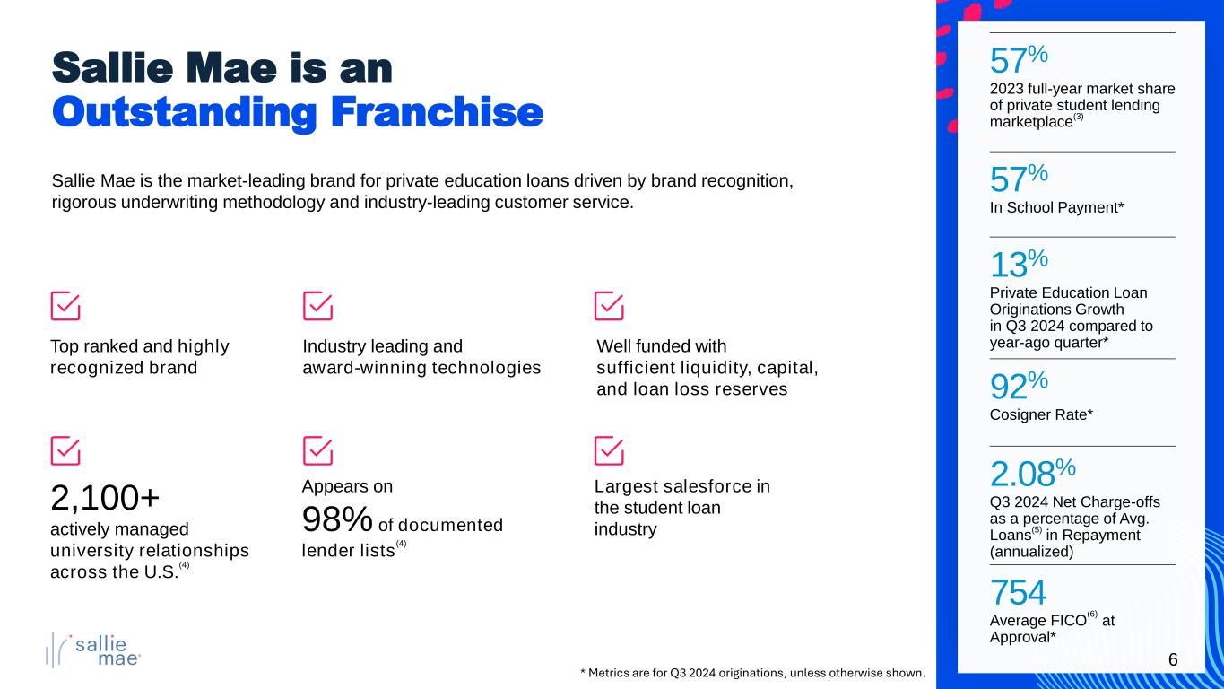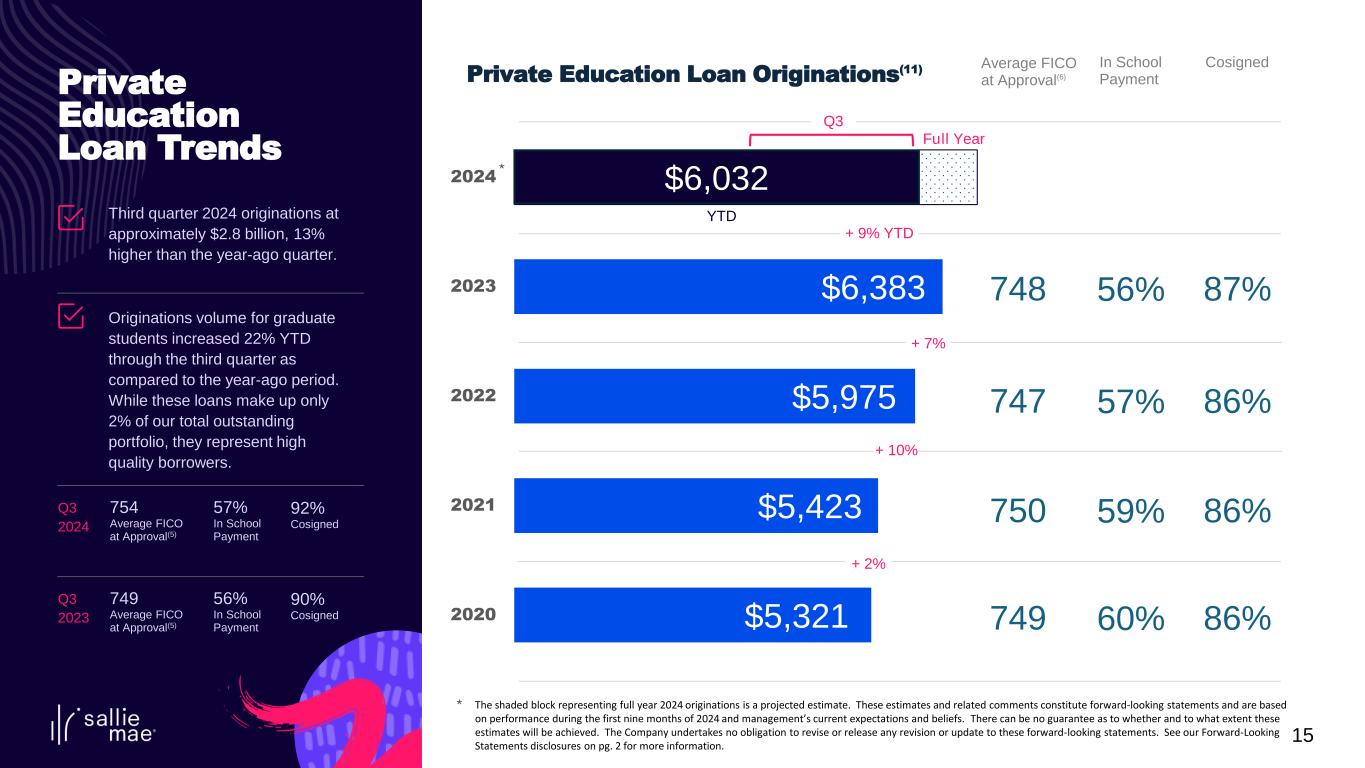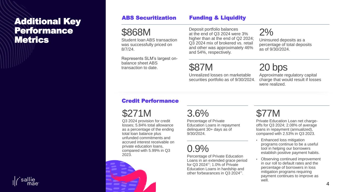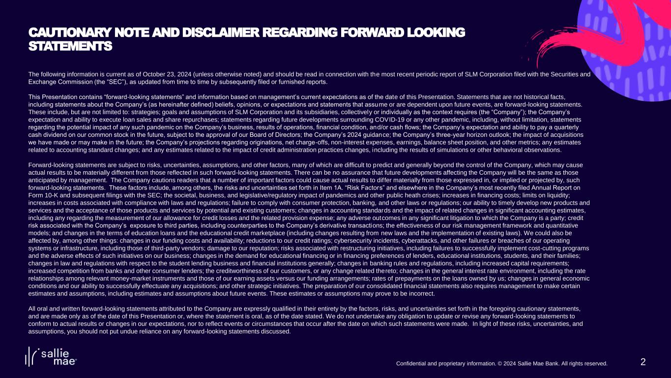 2 The following information is current as of October 23, 2024 (unless otherwise noted) and should be read in connection with the most recent periodic report of SLM Corporation filed with the Securities and Exchange Commission (the “SEC”), as updated from time to time by subsequently filed or furnished reports. This Presentation contains “forward-looking statements” and information based on management’s current expectations as of the date of this Presentation. Statements that are not historical facts, including statements about the Company’s (as hereinafter defined) beliefs, opinions, or expectations and statements that assume or are dependent upon future events, are forward-looking statements. These include, but are not limited to: strategies; goals and assumptions of SLM Corporation and its subsidiaries, collectively or individually as the context requires (the “Company”); the Company’s expectation and ability to execute loan sales and share repurchases; statements regarding future developments surrounding COVID-19 or any other pandemic, including, without limitation, statements regarding the potential impact of any such pandemic on the Company’s business, results of operations, financial condition, and/or cash flows; the Company’s expectation and ability to pay a quarterly cash dividend on our common stock in the future, subject to the approval of our Board of Directors; the Company’s 2024 guidance; the Company’s three-year horizon outlook; the impact of acquisitions we have made or may make in the future; the Company’s projections regarding originations, net charge-offs, non-interest expenses, earnings, balance sheet position, and other metrics; any estimates related to accounting standard changes; and any estimates related to the impact of credit administration practices changes, including the results of simulations or other behavioral observations. Forward-looking statements are subject to risks, uncertainties, assumptions, and other factors, many of which are difficult to predict and generally beyond the control of the Company, which may cause actual results to be materially different from those reflected in such forward-looking statements. There can be no assurance that future developments affecting the Company will be the same as those anticipated by management. The Company cautions readers that a number of important factors could cause actual results to differ materially from those expressed in, or implied or projected by, such forward-looking statements. These factors include, among others, the risks and uncertainties set forth in Item 1A. “Risk Factors” and elsewhere in the Company’s most recently filed Annual Report on Form 10-K and subsequent filings with the SEC; the societal, business, and legislative/regulatory impact of pandemics and other public heath crises; increases in financing costs; limits on liquidity; increases in costs associated with compliance with laws and regulations; failure to comply with consumer protection, banking, and other laws or regulations; our ability to timely develop new products and services and the acceptance of those products and services by potential and existing customers; changes in accounting standards and the impact of related changes in significant accounting estimates, including any regarding the measurement of our allowance for credit losses and the related provision expense; any adverse outcomes in any significant litigation to which the Company is a party; credit risk associated with the Company’s exposure to third parties, including counterparties to the Company’s derivative transactions; the effectiveness of our risk management framework and quantitative models; and changes in the terms of education loans and the educational credit marketplace (including changes resulting from new laws and the implementation of existing laws). We could also be affected by, among other things: changes in our funding costs and availability; reductions to our credit ratings; cybersecurity incidents, cyberattacks, and other failures or breaches of our operating systems or infrastructure, including those of third-party vendors; damage to our reputation; risks associated with restructuring initiatives, including failures to successfully implement cost-cutting programs and the adverse effects of such initiatives on our business; changes in the demand for educational financing or in financing preferences of lenders, educational institutions, students, and their families; changes in law and regulations with respect to the student lending business and financial institutions generally; changes in banking rules and regulations, including increased capital requirements; increased competition from banks and other consumer lenders; the creditworthiness of our customers, or any change related thereto; changes in the general interest rate environment, including the rate relationships among relevant money-market instruments and those of our earning assets versus our funding arrangements; rates of prepayments on the loans owned by us; changes in general economic conditions and our ability to successfully effectuate any acquisitions; and other strategic initiatives. The preparation of our consolidated financial statements also requires management to make certain estimates and assumptions, including estimates and assumptions about future events. These estimates or assumptions may prove to be incorrect. All oral and written forward-looking statements attributed to the Company are expressly qualified in their entirety by the factors, risks, and uncertainties set forth in the foregoing cautionary statements, and are made only as of the date of this Presentation or, where the statement is oral, as of the date stated. We do not undertake any obligation to update or revise any forward-looking statements to conform to actual results or changes in our expectations, nor to reflect events or circumstances that occur after the date on which