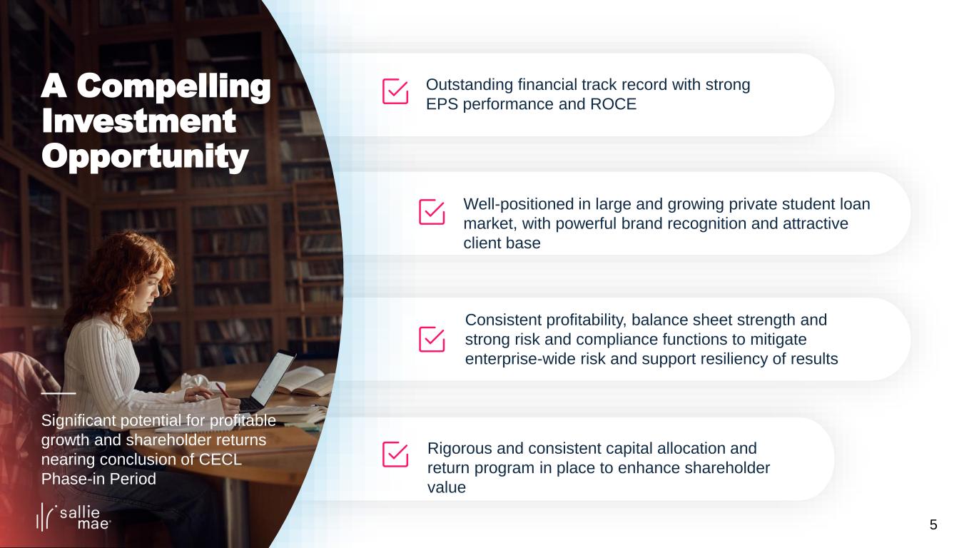 4 $271M Q3 2024 provision for credit losses; 5.84% total allowance as a percentage of the ending total loan balance plus unfunded commitments and accrued interest receivable on private education loans, compared with 5.99% in Q3 2023. 3.6% Percentage of Private Education Loans in repayment delinquent 30+ days as of 9/30/2024. $77M Private Education Loan net charge- offs for Q3 2024; 2.08% of average loans in repayment (annualized), compared with 2.53% in Q3 2023. • Enhanced loss mitigation programs continue to be a useful tool in helping our borrowers establish positive payment habits. • Observing continued improvement in our roll to default rates and the percentage of borrowers in loss mitigation programs requiring payment continues to improve as well. 0.9% Percentage of Private Education Loans in an extended grace period for Q3 2024 (1) ; 1.0% of Private Education Loans in hardship and other forbearances in Q3 2024 (2) . Additional Key Performance Metrics Credit Performance Deposit portfolio balances at the end of Q3 2024 were 3% higher than at the end of Q2 2024; Q3 2024 mix of brokered vs. retail and other was approximately 46% and 54%, respectively. 2% Uninsured deposits as a percentage of total deposits as of 9/30/2024. $87M Unrealized losses on marketable securities portfolio as of 9/30/2024. 20 bps Approximate regulatory capital charge that would result if losses were realized. Funding & LiquidityABS Securitization $868M Student loan ABS transaction was successfully priced on 8/7/24. Represents SLM’s largest on- balance sheet ABS transaction to date.