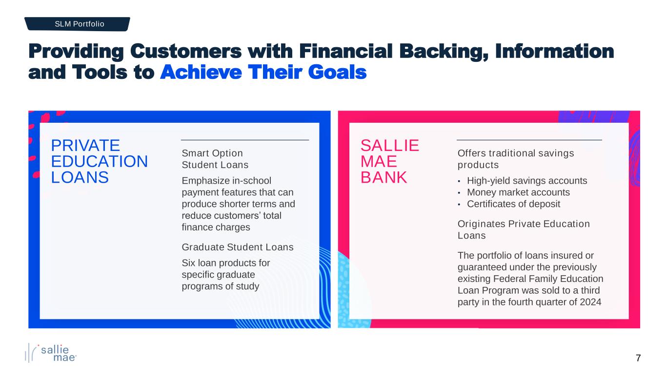 6 57% 2023 full-year market share of private student lending marketplace (3) 57% In School Payment* 13% Private Education Loan Originations Growth in Q3 2024 compared to year-ago quarter* 92% Cosigner Rate* 2.08% Q3 2024 Net Charge-offs as a percentage of Avg. Loans (5) in Repayment (annualized) 754 Average FICO (6) at Approval* Top ranked and highly recognized brand Industry leading and award-winning technologies Well funded with sufficient liquidity, capital, and loan loss reserves Sallie Mae is the market-leading brand for private education loans driven by brand recognition, rigorous underwriting methodology and industry-leading customer service. 2,100+ actively managed university relationships across the U.S. (4) Appears on 98% of documented lender lists (4) Largest salesforce in the student loan industry Sallie Mae is an Outstanding Franchise * Metrics are for Q3 2024 originations, unless otherwise shown.