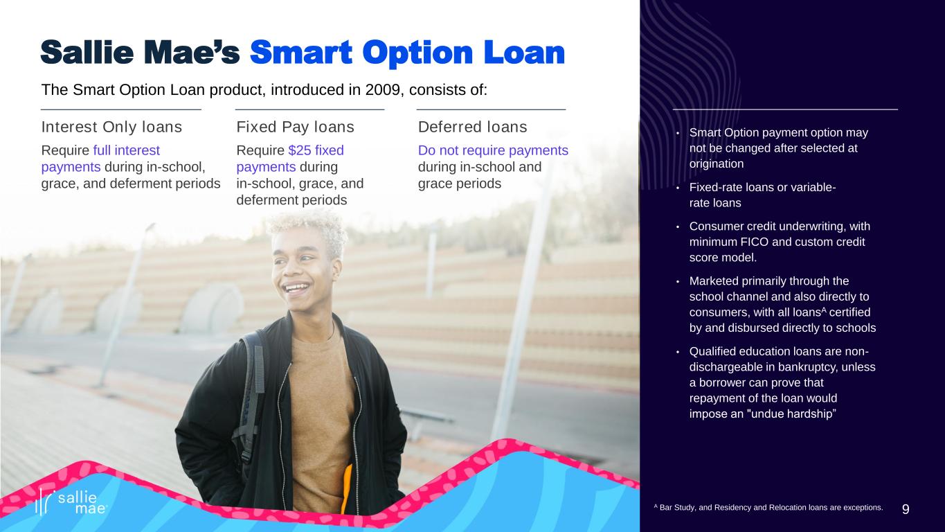 8 Private Education Loan Portfolio High Quality Private Education Loan Portfolio $21.8B Loans 24% Variable 76% Fixed Portfolio Interest Rate Type 47% Deferred 35% Fixed Pay 18% Interest Only $19.2B Loans Customer FICO at Original Approval (6) 46% 750+ 8% <670 14% 670-699 32% 700-749 FICO 754 Weighted Avg. 25% 2023 2% Pre 2014 2% 2014 3% 2015 3% 2016 4% 2017 5% 2018 6% 2019 7% 2020 10% 2021 15% 2022 $21.8B Loans As of 9/30/2024 19% 2024 Originations Vintage (7) Smart Option Payment Type