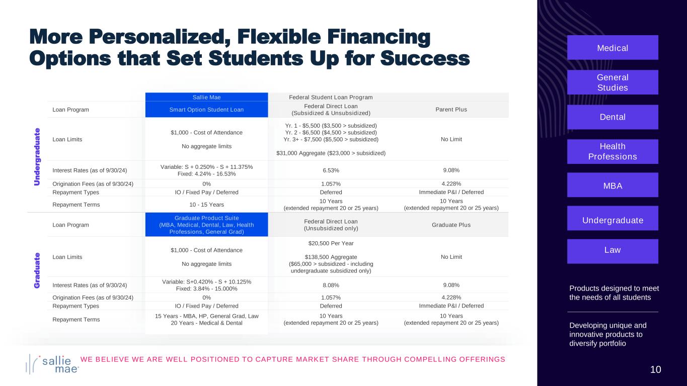 10 More Personalized, Flexible Financing Options that Set Students Up for Success WE BELIEVE WE ARE WELL POSITIONED TO CAPTURE MARKET SHARE THROUGH COMPELLING OFFERINGS Sallie Mae Federal Student Loan Program U n d e rg ra d u a te Loan Program Smart Option Student Loan Federal Direct Loan (Subsidized & Unsubsidized) Parent Plus Loan Limits $1,000 - Cost of Attendance No aggregate limits Yr. 1 - $5,500 ($3,500 > subsidized) Yr. 2 - $6,500 ($4,500 > subsidized) Yr. 3+ - $7,500 ($5,500 > subsidized) $31,000 Aggregate ($23,000 > subsidized) No Limit Interest Rates (as of 9/30/24) Variable: S + 0.250% - S + 11.375% Fixed: 4.24% - 16.53% 6.53% 9.08% Origination Fees (as of 9/30/24) 0% 1.057% 4.228% Repayment Types IO / Fixed Pay / Deferred Deferred Immediate P&I / Deferred Repayment Terms 10 - 15 Years 10 Years (extended repayment 20 or 25 years) 10 Years (extended repayment 20 or 25 years) G ra d u a te Loan Program Graduate Product Suite (MBA, Medical, Dental, Law, Health Professions, General Grad) Federal Direct Loan (Unsubsidized only) Graduate Plus Loan Limits $1,000 - Cost of Attendance No aggregate limits $20,500 Per Year $138,500 Aggregate ($65,000 > subsidized - including undergraduate subsidized only) No Limit Interest Rates (as of 9/30/24) Variable: S+0.420% - S + 10.125% Fixed: 3.84% - 15.000% 8.08% 9.08% Origination Fees (as of 9/30/24) 0% 1.057% 4.228% Repayment Types IO / Fixed Pay / Deferred Deferred Immediate P&I / Deferred Repayment Terms 15 Years - MBA, HP, General Grad, Law 20 Years - Medical & Dental 10 Years (extended repayment 20 or 25 years) 10 Years (extended repayment 20 or 25 years) Products designed to meet the needs of all students Developing unique and innovative products to diversify portfolio Medical General Studies Dental Health Professions MBA Undergraduate Law