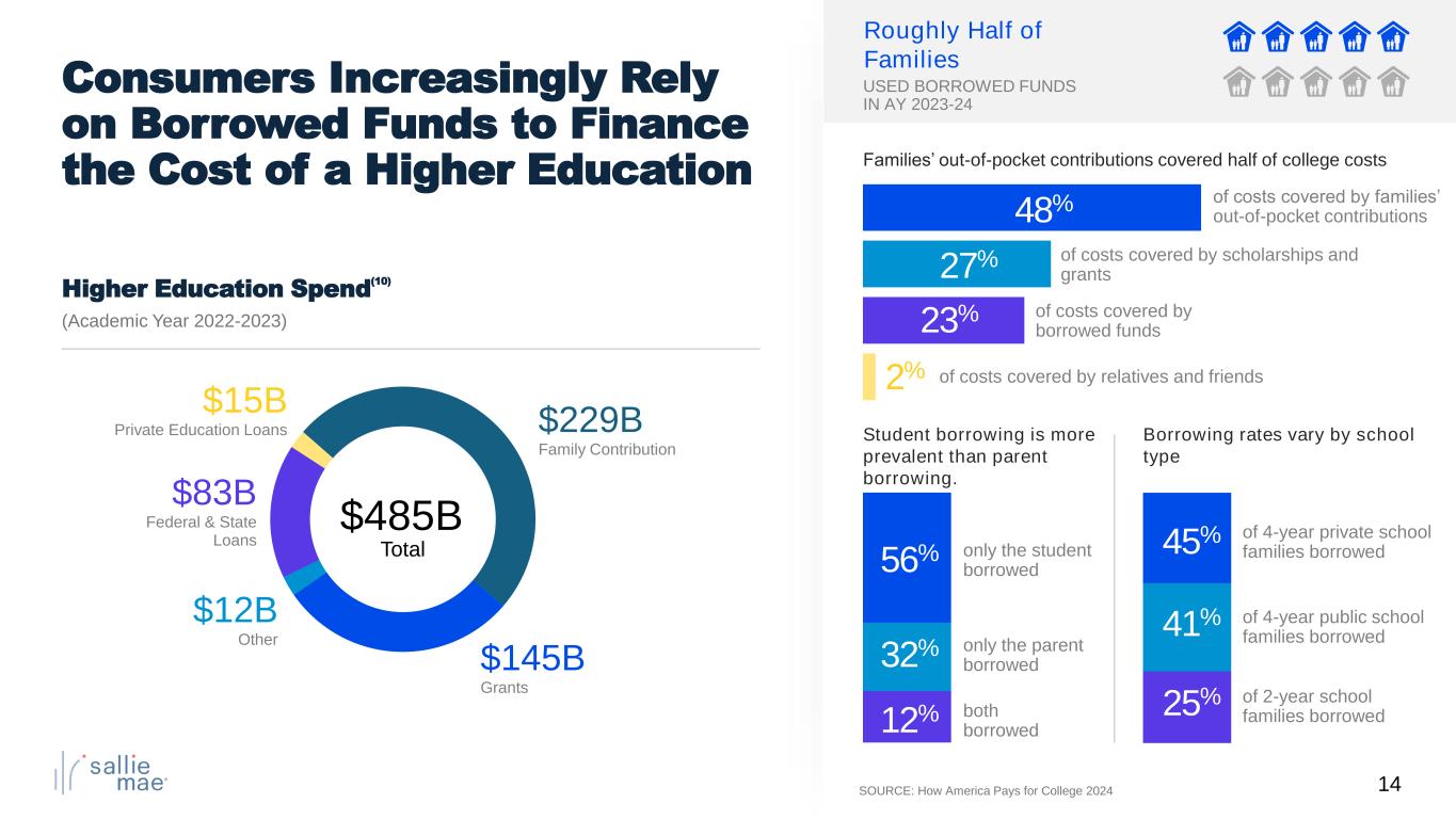 14 Consumers Increasingly Rely on Borrowed Funds to Finance the Cost of a Higher Education Roughly Half of Families Student borrowing is more prevalent than parent borrowing. Borrowing rates vary by school type USED BORROWED FUNDS IN AY 2023-24 SOURCE: How America Pays for College 2024 Families’ out-of-pocket contributions covered half of college costs $229B Family Contribution $145B Grants $12B Other $15B Private Education Loans Higher Education Spend (10) (Academic Year 2022-2023) $83B Federal & State Loans $485B Total 56% only the student borrowed 32% only the parent borrowed 12% both borrowed 45% of 4-year private school families borrowed 41% of 4-year public school families borrowed 25% of 2-year school families borrowed of costs covered by families’ out-of-pocket contributions of costs covered by scholarships and grants of costs covered by borrowed funds of costs covered by relatives and friends 48% 27% 23% 2%