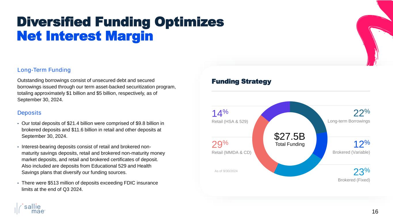 15 $5,321 $5,423 $5,975 $6,383 2020 2021 2022 2023 2024 87%748 56% 86%747 57% 86%750 59% Private Education Loan Trends Third quarter 2024 originations at approximately $2.8 billion, 13% higher than the year-ago quarter. Originations volume for graduate students increased 22% YTD through the third quarter as compared to the year-ago period. While these loans make up only 2% of our total outstanding portfolio, they represent high quality borrowers. Average FICO at Approval(6) In School Payment Cosigned Private Education Loan Originations(11) + 10% + 7% + 9% YTD 754 Average FICO at Approval(5) 57% In School Payment 92% Cosigned Q3 2024 749 Average FICO at Approval(5) 56% In School Payment 90% Cosigned Q3 2023 + 2% 86%749 60% Full Year * * The shaded block representing full year 2024 originations is a projected estimate. These estimates and related comments constitute forward-looking statements and are based on performance during the first nine months of 2024 and management’s current expectations and beliefs. There can be no guarantee as to whether and to what extent these estimates will be achieved. The Company undertakes no obligation to revise or release any revision or update to these forward-looking statements. See our Forward-Looking Statements disclosures on pg. 2 for more information. $6,032 Q3 YTD
