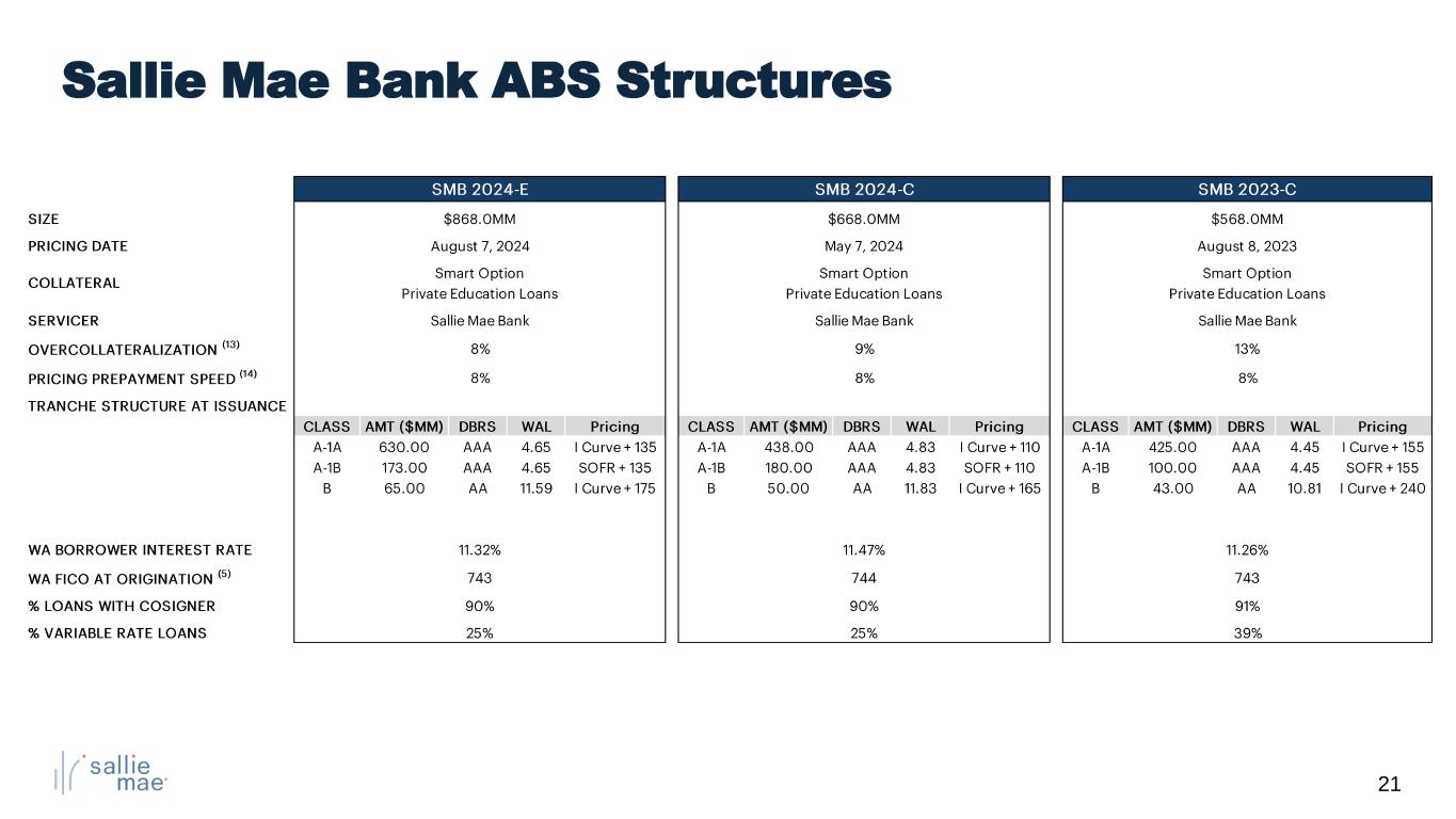 20 Sallie Mae Bank ABS Summary – Last 12 Quarters (On-Balance Sheet)* * Pool characteristics represent the last three years of issuance as of the Statistical Cutoff Date for the respective transaction. 21-D 21-E 22-C 23-A 23-C 24-C 24-E Issuance Date 8/18/2021 11/9/2021 8/9/2022 3/15/2023 8/16/2023 5/15/2024 8/14/2024 Total Bond Amount ($mil) $527 $534 $575 $579 $568 $668 $868 Initial AAA Enhancement (%) 13% 12% 22% 18% 19% 16% 15% Initial Class B Enhancement (%) 6% 5% 16% 11% 13% 9% 8% Wtd Avg Spread over Benchmarks 'AAA' Rated A Classes (%) +0.62% +0.63% +1.64% +1.41% +1.55% +1.10% +1.35% A and B Classes Combined (%) +0.69% +0.69% +1.76% +1.53% +1.69% +1.19% +1.42% Loan Program (%) Smart Option 100% 100% 100% 100% 100% 100% 100% Loan Status (%) (12) School, Grace, Deferment 58% 59% 59% 62% 61% 70% 63% P&I Repayment 40% 40% 41% 37% 39% 28% 36% Forbearance 2% 1% 1% 1% 1% 2% 1% Wtd Avg Term to Maturity (Mo.) 143 143 145 160 159 172 170 % Loans with CoSigner 92% 92% 92% 92% 91% 90% 90% Not For Profit (%) 90% 90% 92% 92% 90% 87% 88% Wtd Avg FICO at Origination (6) 742 741 743 744 743 744 743 Wtd Avg Recent FICO at Issuance (6) 745 745 745 742 741 738 738 Wtd Avg FICO at Origination (Cosigner) 744 743 745 746 745 746 745 Wtd Avg Recent FICO at Issuance (Cosigner) 748 748 748 745 745 742 742 Wtd Avg FICO at Origination (Borrower) 721 720 722 722 724 727 726 Wtd Avg Recent FICO at Issuance (Borrower) 712 711 706 701 703 701 700 Variable Rate Loans (%) 50% 50% 48% 43% 39% 25% 25% Wtd Avg Annual Borrower Interest Rate 8.64% 8.68% 9.30% 10.86% 11.26% 11.47% 11.32%