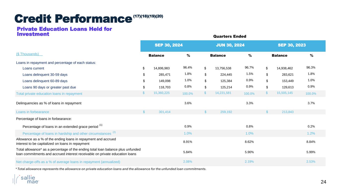 23 Q3 2024 Q2 2024 Q3 2023 Statement of Operations ($ Millions) Total interest income $653 $641 $652 Total interest expense 293 269 268 Net Interest Income 359 372 385 Less: provisions for credit losses 271 17 198 Total non-interest income 24 142 24 Total non-interest expenses 172 159 170 Income tax expense (benefit) (14) 87 11 Net Income (Loss) $(45) $252 $29 Preferred stock dividends 5 5 5 Net income (loss) attributable to common stock (50) 247 25 Ending Balances ($ Millions) Private Education Loans held for investment, net $20,460 $18,433 $20,348 FFELP Loans held for investment, net - 483 551 FFELP Loans held for sale, net 486 - - Deposits $21,445 $20,744 $21,551 Brokered 9,844 10,033 10,376 Retail and other 11,601 10,711 11,175 Q3 2024 Q2 2024 Q3 2023 Key Performance Metrics Net Interest Margin 5.00% 5.36% 5.43% Yield—Total Interest-earning assets 9.07% 9.25% 9.21% Private Education Loans 10.79% 10.91% 10.96% Cost of Funds 4.35% 4.16% 4.00% Return on Assets (“ROA”)(15) (0.6)% 3.6% 0.4% Return on Common Equity (“ROCE”)(16) (10.2)% 50.6% 6.3% Private Education Loan Sales $- $1,590 $- Per Common Share GAAP diluted earnings (loss) per common share $(0.23) $1.11 $0.11 Average common and common equivalent shares outstanding (millions) 215 222 229 Quarterly Financial Highlights