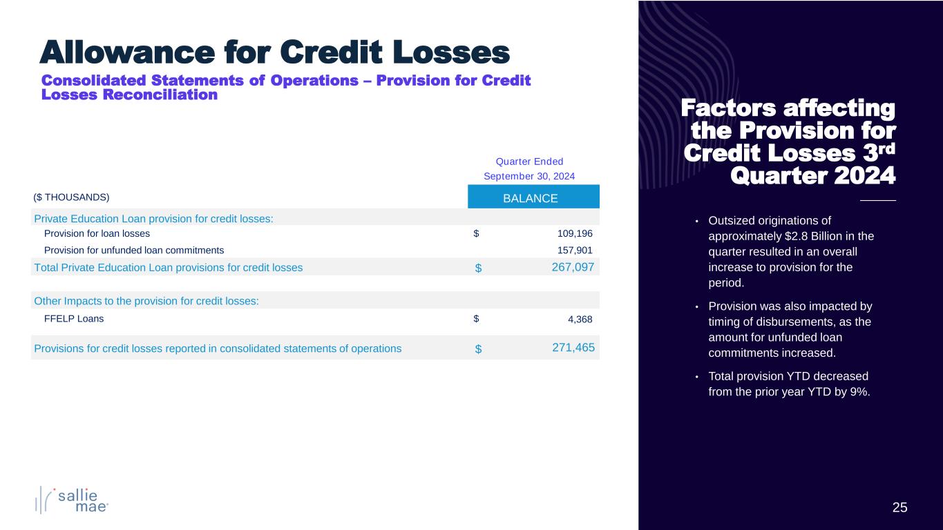 24 Credit Performance (17)(18)(19)(20) Private Education Loans Held for Investment ($ Thousands) Balance % Balance % Balance % Loans in repayment and percentage of each status: Loans current 14,806,983$ 96.4% 13,756,538$ 96.7% 14,938,462$ 96.3% Loans delinquent 30-59 days 285,471$ 1.8% 224,445$ 1.5% 283,621$ 1.8% Loans delinquent 60-89 days 149,098$ 1.0% 125,384$ 0.9% 153,449$ 1.0% Loans 90 days or greater past due 118,703$ 0.8% 125,214$ 0.9% 129,613$ 0.9% Total private education loans in repayment 15,360,225$ 100.0% 14,231,581$ 100.0% 15,505,145$ 100.0% Delinquencies as % of loans in repayment 3.6% 3.3% 3.7% Loans in forbearance 301,414$ 259,192$ 213,843$ Percentage of loans in forbearance: Percentage of loans in an extended grace period (1) 0.9% 0.8% 0.2% Percentage of loans in hardship and other circumstances (2) 1.0% 1.0% 1.2% 8.91% 8.62% 8.84% 5.84% 5.90% 5.99% Net charge-offs as a % of average loans in repayment (annualized) 2.08% 2.19% 2.53% Total allowance* as a percentage of the ending total loan balance plus unfunded loan commitments and accrued interest receivable on private education loans SEP 30, 2023 Quarters Ended Allowance as a % of the ending loans in repayment and accrued interest to be capitalized on loans in repayment SEP 30, 2024 JUN 30, 2024 * Total allowance represents the allowance on private education loans and the allowance for the unfunded loan commitments.