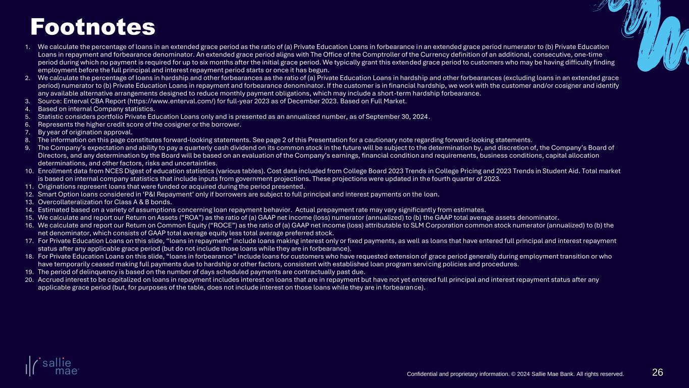 26Confidential and proprietary information. © 2024 Sallie Mae Bank. All rights reserved. 1. We calculate the percentage of loans in an extended grace period as the ratio of (a) Private Education Loans in forbearance in an extended grace period numerator to (b) Private Education Loans in repayment and forbearance denominator. An extended grace period aligns with The Office of the Comptroller of the Currency definition of an additional, consecutive, one-time period during which no payment is required for up to six months after the initial grace period. We typically grant this extended grace period to customers who may be having difficulty finding employment before the full principal and interest repayment period starts or once it has begun. 2. We calculate the percentage of loans in hardship and other forbearances as the ratio of (a) Private Education Loans in hardship and other forbearances (excluding loans in an extended grace period) numerator to (b) Private Education Loans in repayment and forbearance denominator. If the customer is in financial hardship, we work with the customer and/or cosigner and identify any available alternative arrangements designed to reduce monthly payment obligations, which may include a short-term hardship forbearance. 3. Source: Enterval CBA Report (https://www.enterval.com/) for full-year 2023 as of December 2023. Based on Full Market. 4. Based on internal Company statistics. 5. Statistic considers portfolio Private Education Loans only and is presented as an annualized number, as of September 30, 2024. 6. Represents the higher credit score of the cosigner or the borrower. 7. By year of origination approval. 8. The information on this page constitutes forward-looking statements. See page 2 of this Presentation for a cautionary note regarding forward-looking statements. 9. The Company’s expectation and ability to pay a quarterly cash dividend on its common stock in the future will be subject to the determination by, and discretion of, the Company’s Board of Directors, and any determination by the Board will be based on an evaluation of the Company’s earnings, financial condition and requirements, business conditions, capital allocation determinations, and other factors, risks and uncertainties. 10. Enrollment data from NCES Digest of education statistics (various tables). Cost data included from College Board 2023 Trends in College Pricing and 2023 Trends in Student Aid. Total market is based on internal company statistics that include inputs from government projections. These projections were updated in the fourth quarter of 2023. 11. Originations represent loans that were funded or acquired during the period presented. 12. Smart Option loans considered in ‘P&I Repayment’ only if borrowers are subject to full principal and interest payments on the loan. 13. Overcollateralization for Class A & B bonds. 14. Estimated based on a variety of assumptions concerning loan repayment behavior. Actual prepayment rate may vary significantly from estimates. 15. We calculate and report our Return on Assets (“ROA”) as the ratio of (a) GAAP net income (loss) numerator (annualized) to (b) the GAAP total average assets denominator. 16. We calculate and report our Return on Common Equity (“ROCE”) as the ratio of (a) GAAP net income (loss) attributable to SLM Corporation common stock numerator (annualized) to (b) the net denominator, which consists of GAAP total average equity less total average preferred stock. 17. For Private Education Loans on this slide, “loans in repayment” include loans making interest only or fixed payments, as well as loans that have entered full principal and interest repayment status after any applicable grace period (but do not include those loans while they are in forbearance). 18. For Private Education Loans on this slide, “loans in forbearance” include loans for customers who have requested extension of grace period generally during employment transition or who have temporarily ceased making full payments due to hardship or other factors, consistent with established loan program servicing policies and procedures. 19. The period of delinquency is based on the number of days scheduled payments are contractually past due. 20. Accrued interest to be capitalized on loans in repayment includes interest on loans that are in repayment but have not yet entered full principal and interest repayment status after any applicable grace period (but, for purposes of the table, does not include interest on those loans while they are in forbearance). Footnotes