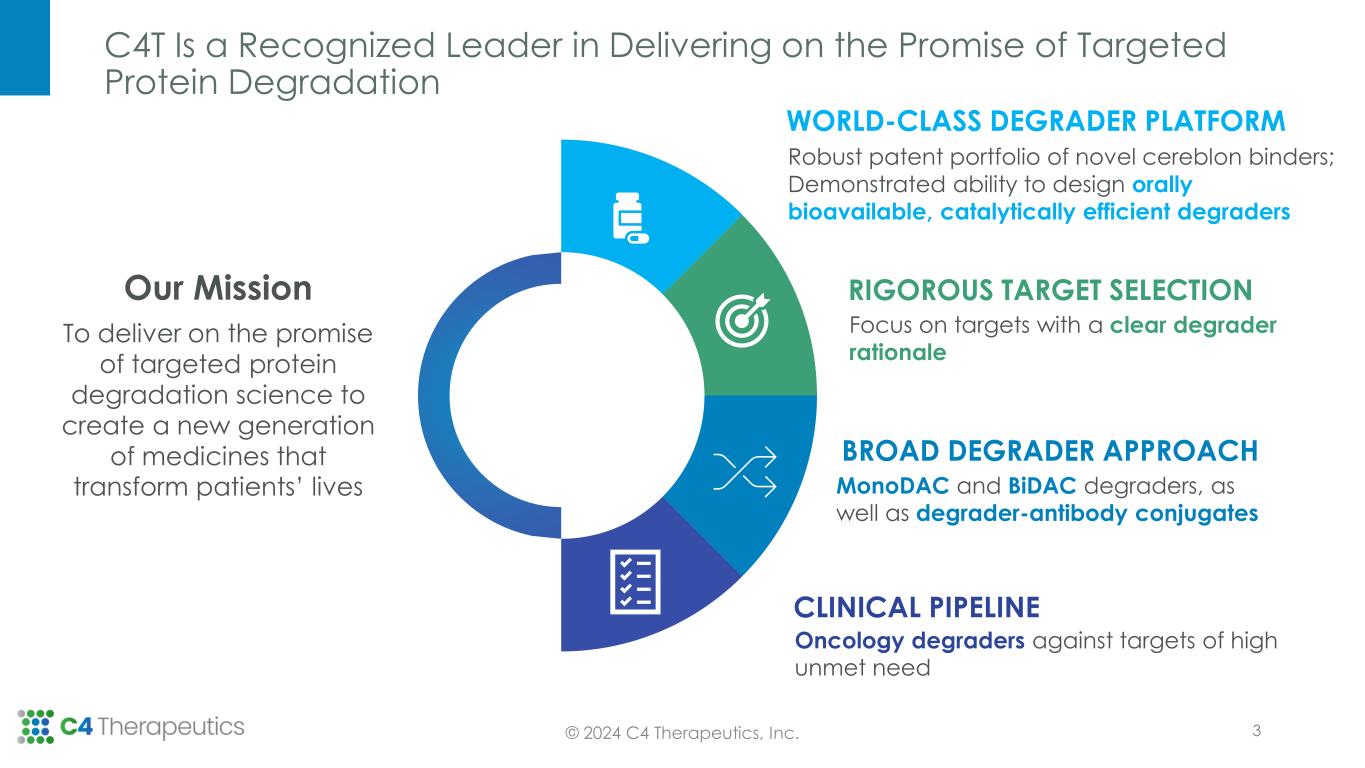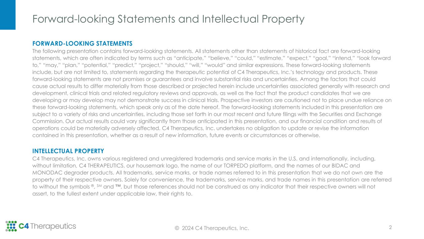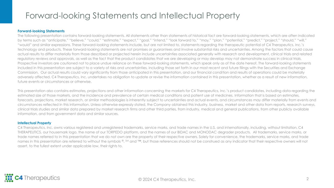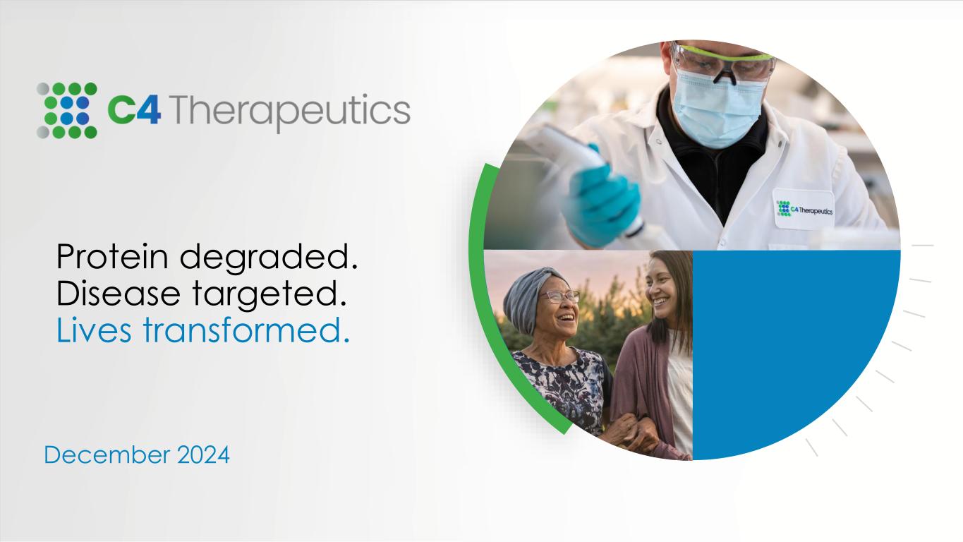 C4T Webcast for Analysts and Investors C4T will host an investor webcast today December 8, 2024, at 5 pm EST. To join the webcast, please visit this link or the “Events & Presentations” page of the Investors section on the company’s website at www.c4therapeutics.com. A replay of the webcast will be archived and available following the event.