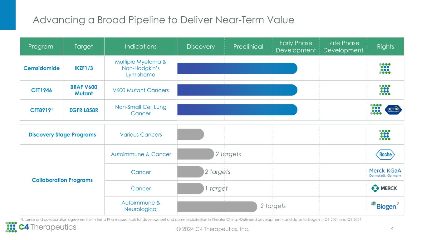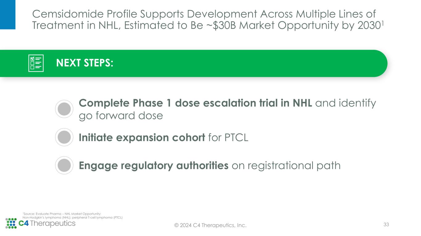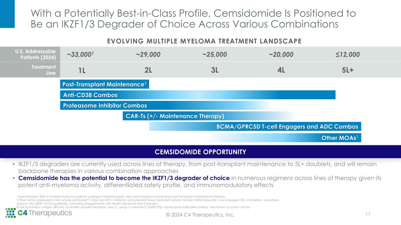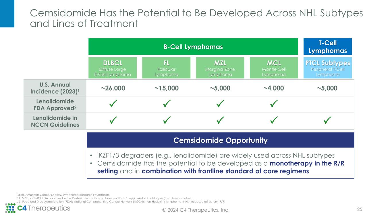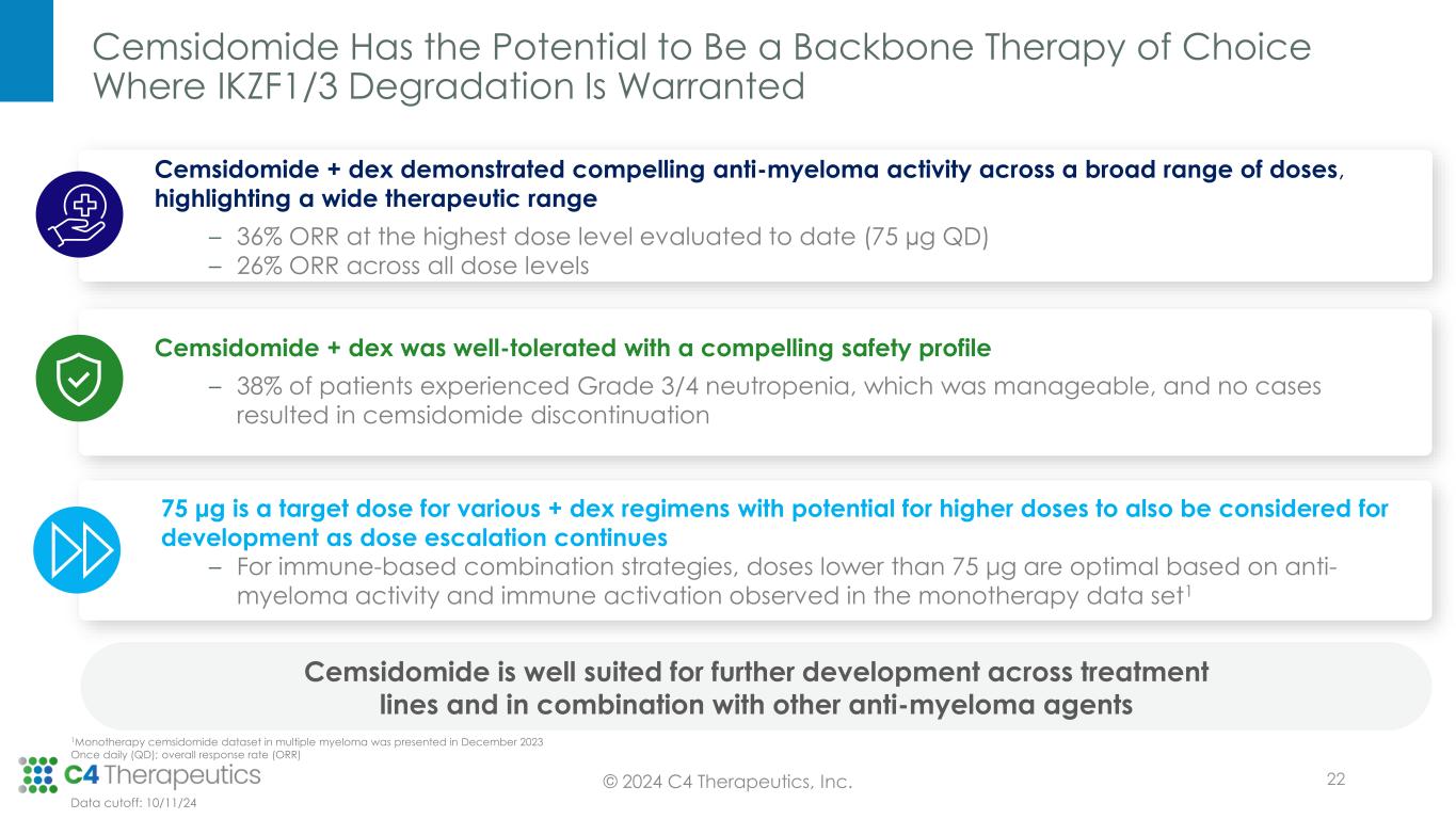 “Cemsidomide continues to deliver clinical data demonstrating its potential to be used in both multi-refractory patients and as part of combination therapies across all lines of treatment for a significant number of patients with multiple myeloma or non-Hodgkin’s lymphoma,” said Len Reyno, M.D., chief medical officer of C4 Therapeutics. “We look forward to leveraging today’s data to inform clinical development strategies in both multiple myeloma and non-Hodgkin’s lymphoma that has the potential to unlock the value of cemsidomide for patients in need of innovative therapies across treatment lines.”