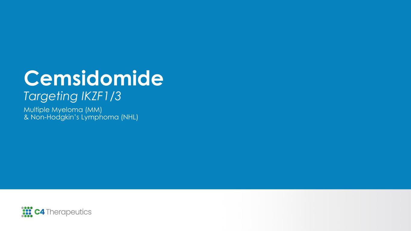 C4T designed cemsidomide to be a more potent and selective degrader of IKZF1/3 with unique pharmacokinetic properties, with the goal to improve the therapeutic index to treat multiple myeloma and non-Hodgkin’s lymphoma—both alone and in combination with other therapeutic agents in these therapeutic areas.