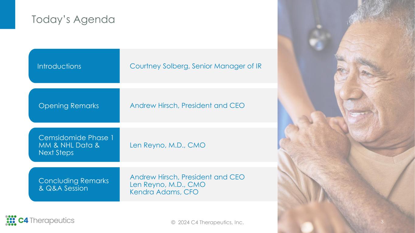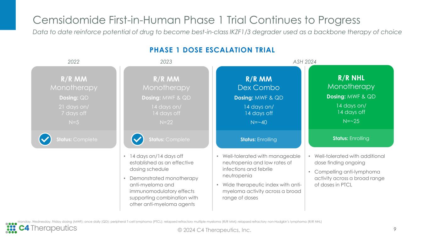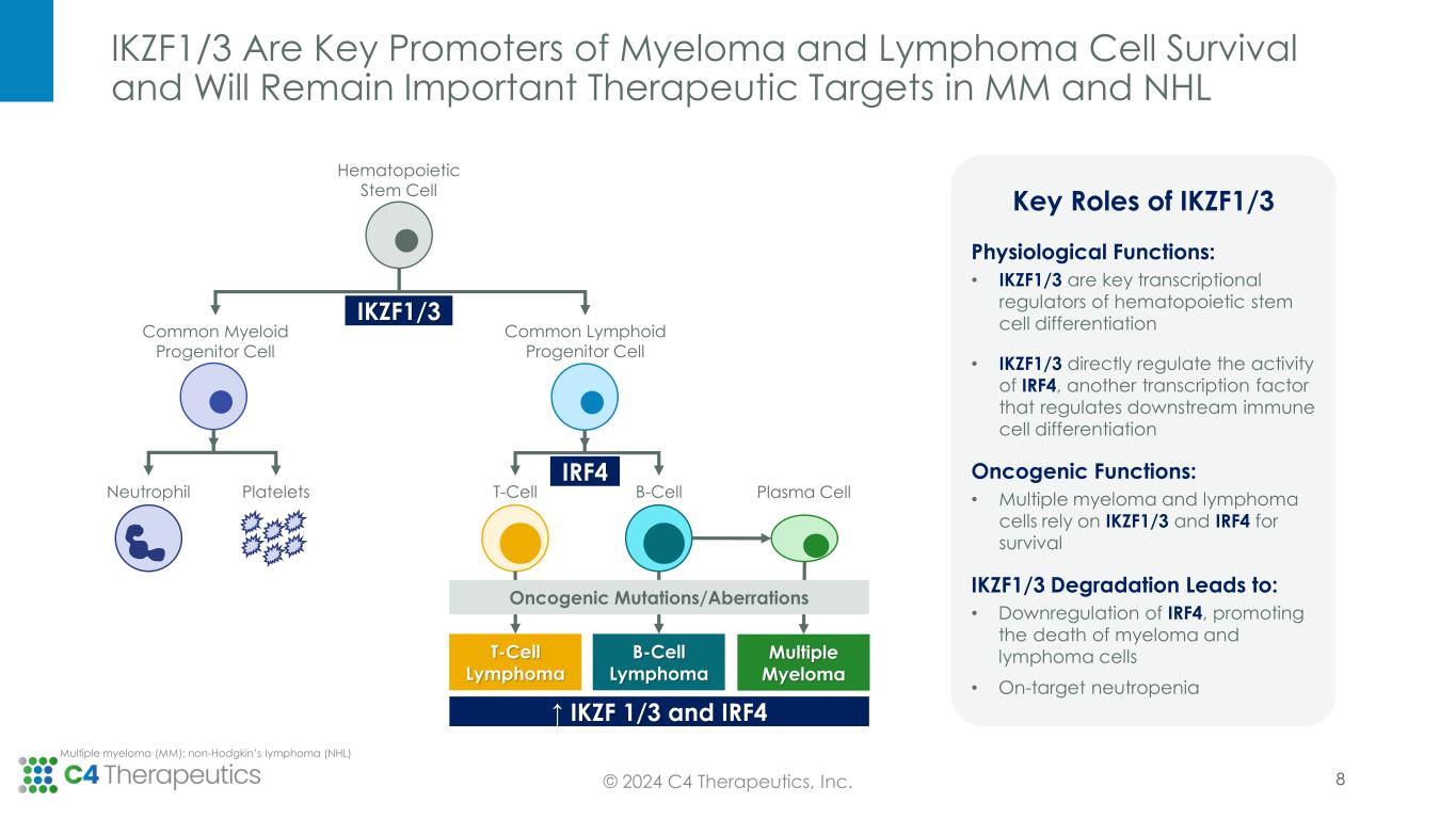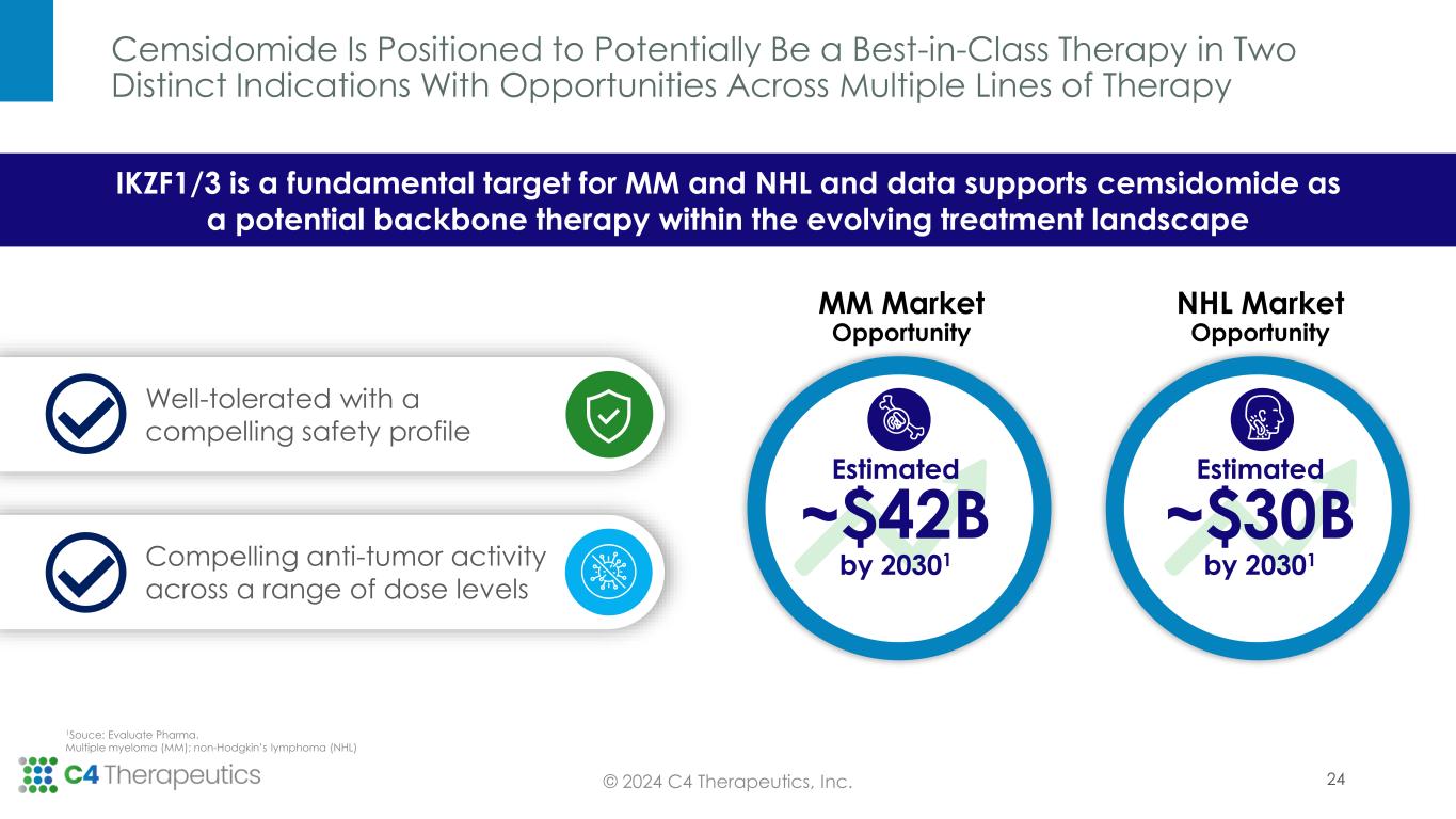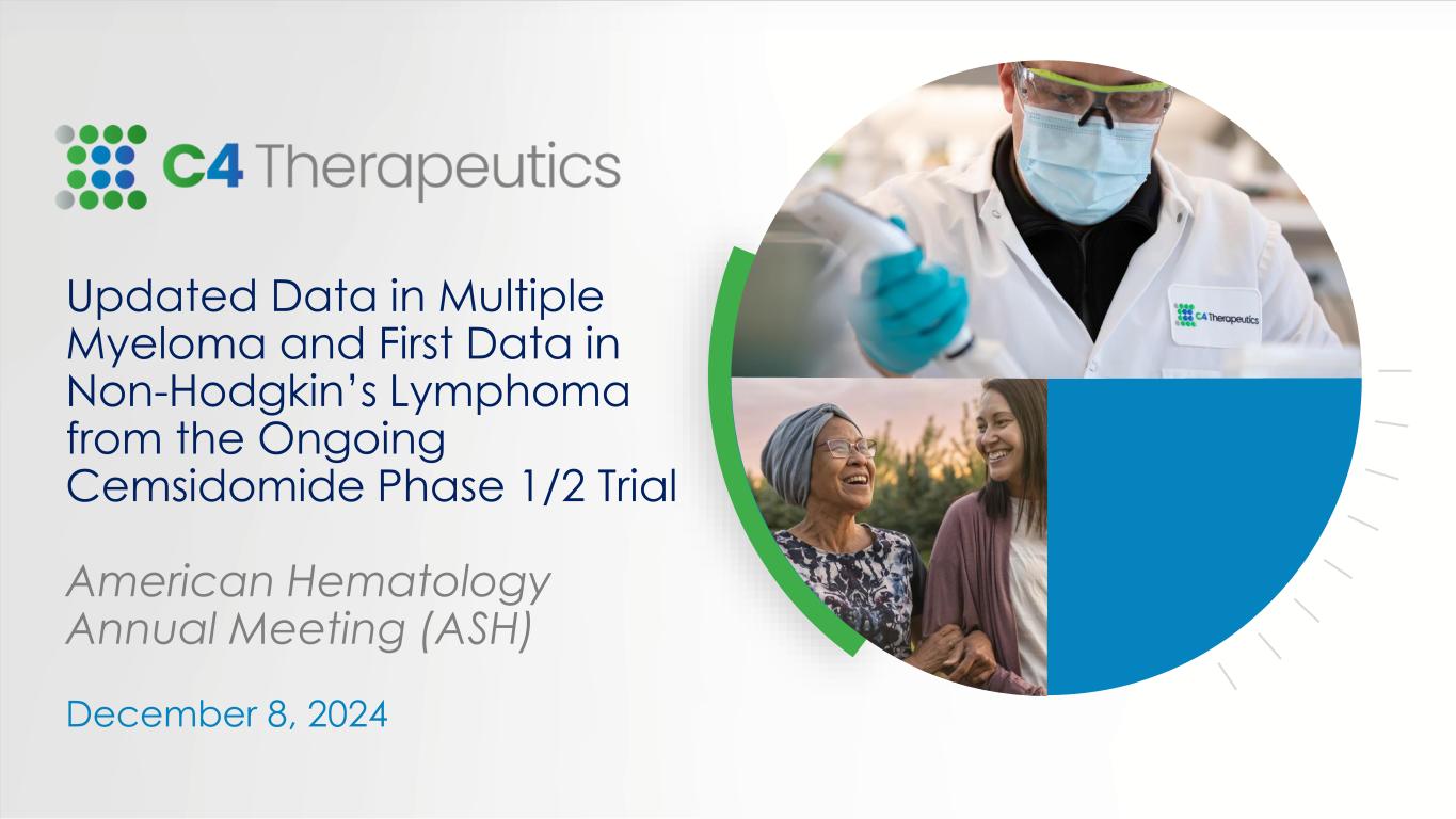 WATERTOWN, Mass., December 8, 2024 (GLOBE NEWSWIRE) -- C4 Therapeutics, Inc. (C4T) (Nasdaq: CCCC), a clinical-stage biopharmaceutical company dedicated to advancing targeted protein degradation science, today presented clinical data from the ongoing Phase 1 trial of cemsidomide, an orally bioavailable small molecule degrader of IKZF1/3, at the ASH Annual Meeting. Presentations included a poster highlighting results for cemsidomide in combination with dexamethasone in multiple myeloma, and an oral presentation delivering initial results for cemsidomide as a monotherapy for non-Hodgkin’s lymphoma. These presentations reinforce the potential of cemsidomide to become a backbone therapy of choice in both multiple myeloma and non-Hodgkin’s lymphoma where IKZF1/3 degradation is warranted.