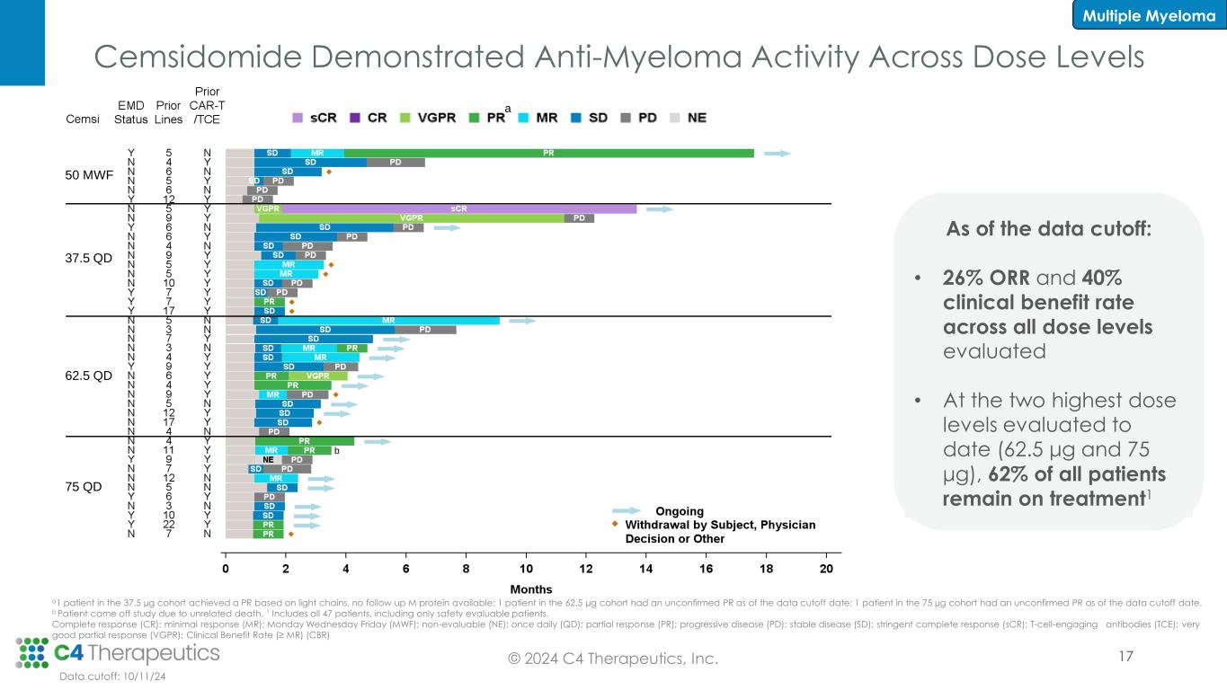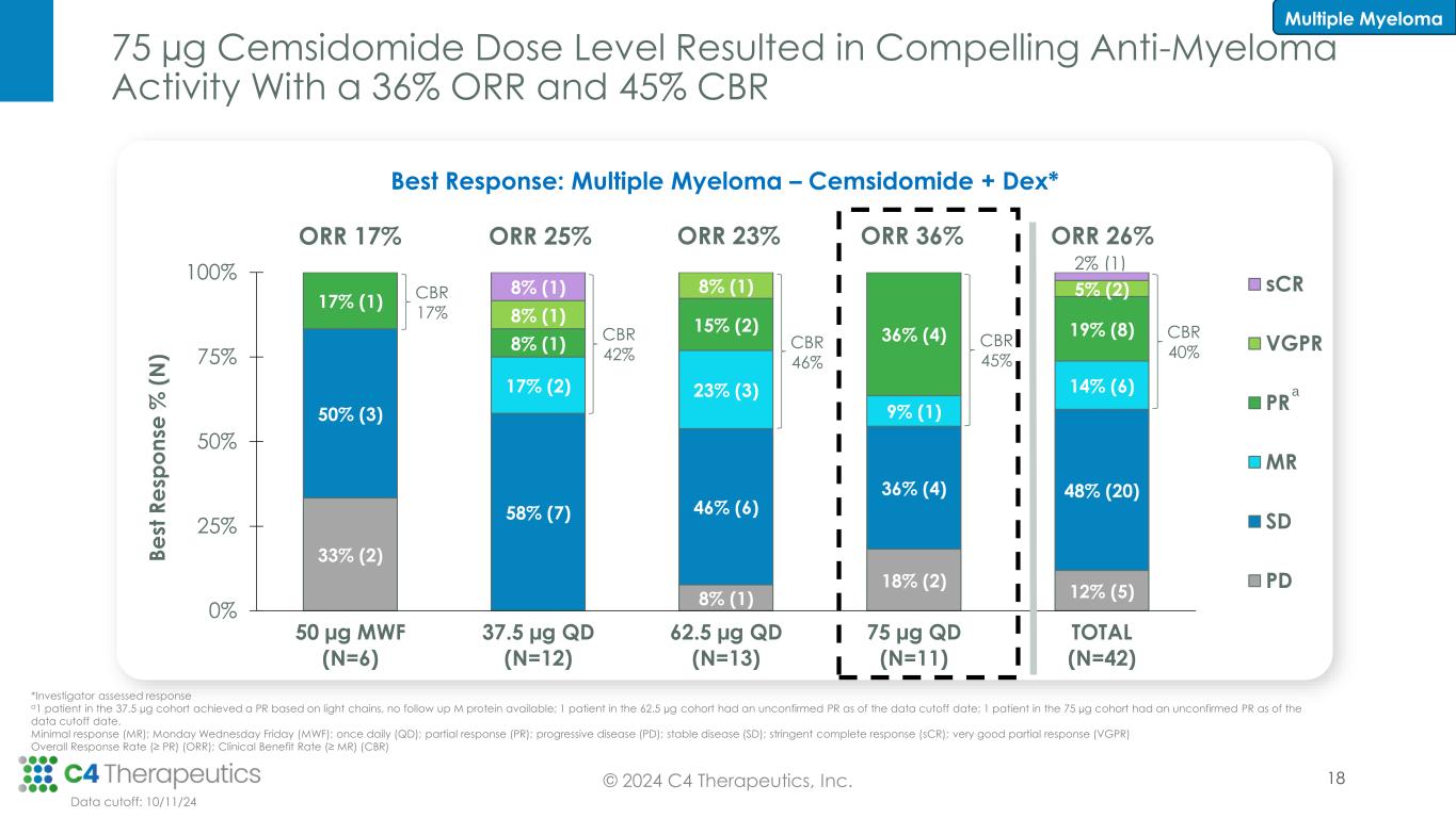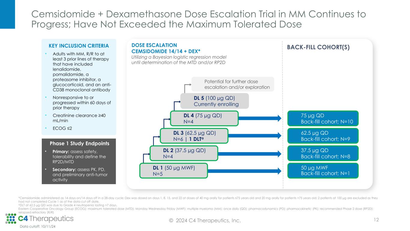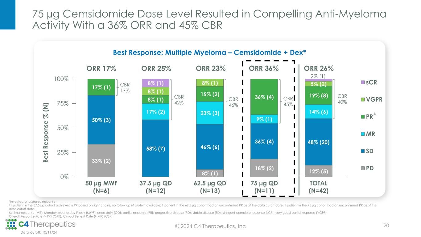 C4T has identified 75 µg QD as a target dose for various dexamethasone combination regimens; as dose escalation continues, higher doses may also be considered. For immune-based combination strategies, C4T believes doses lower than 75 µg QD will be optimal based on anti-myeloma activity and immune activation observed in the previously disclosed monotherapy data set.