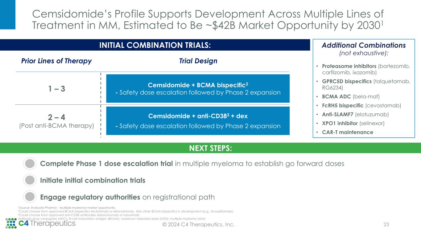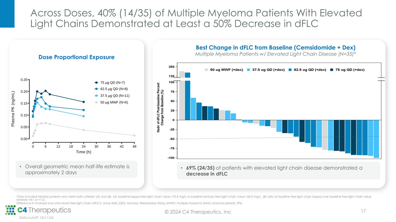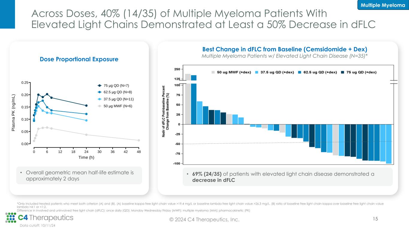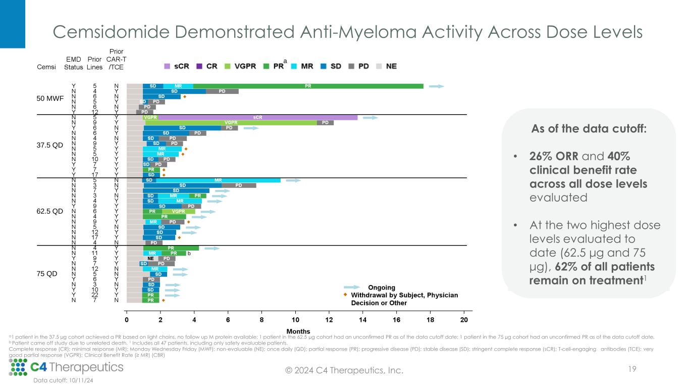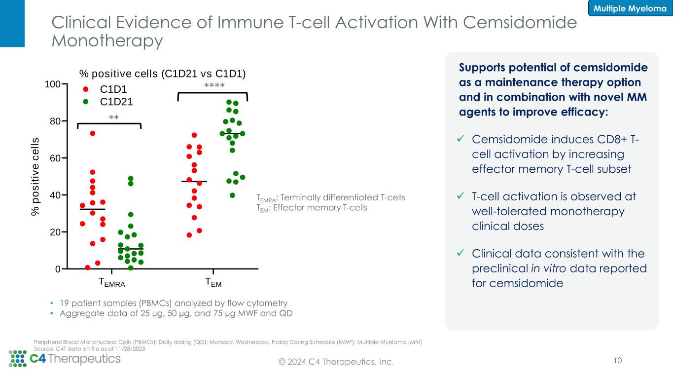C4T has identified 75 µg QD as a target dose for various dexamethasone combination regimens; as dose escalation continues, higher doses may also be considered. For immune-based combination strategies, C4T believes doses lower than 75 µg QD will be optimal based on anti-myeloma activity and immune activation observed in the previously disclosed monotherapy data set.