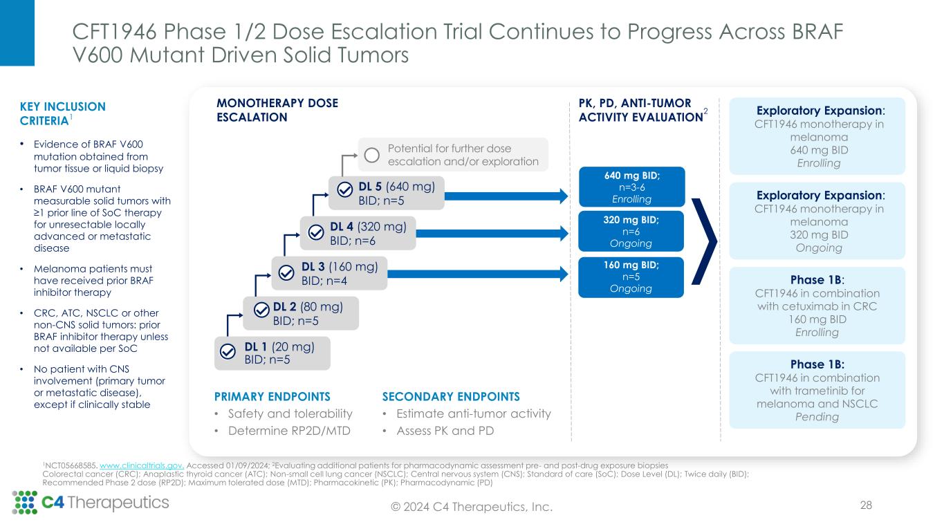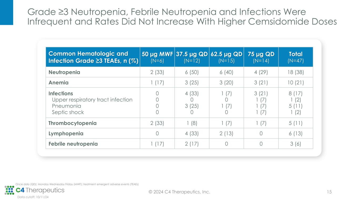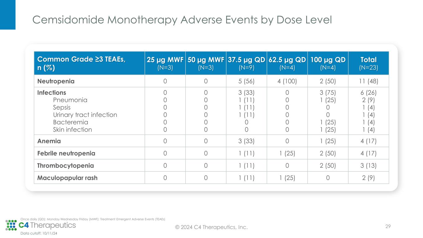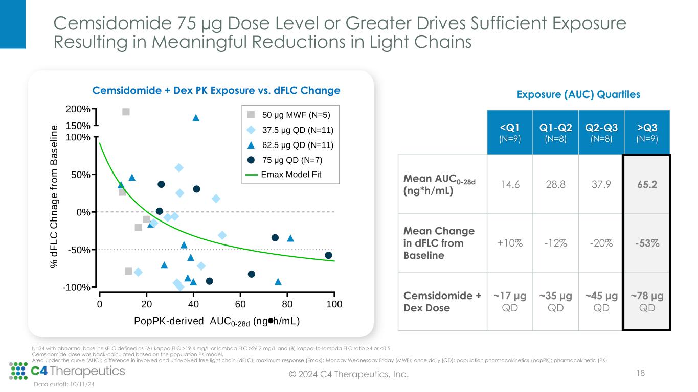 C4T has identified 75 µg QD as a target dose for various dexamethasone combination regimens; as dose escalation continues, higher doses may also be considered. For immune-based combination strategies, C4T believes doses lower than 75 µg QD will be optimal based on anti-myeloma activity and immune activation observed in the previously disclosed monotherapy data set.