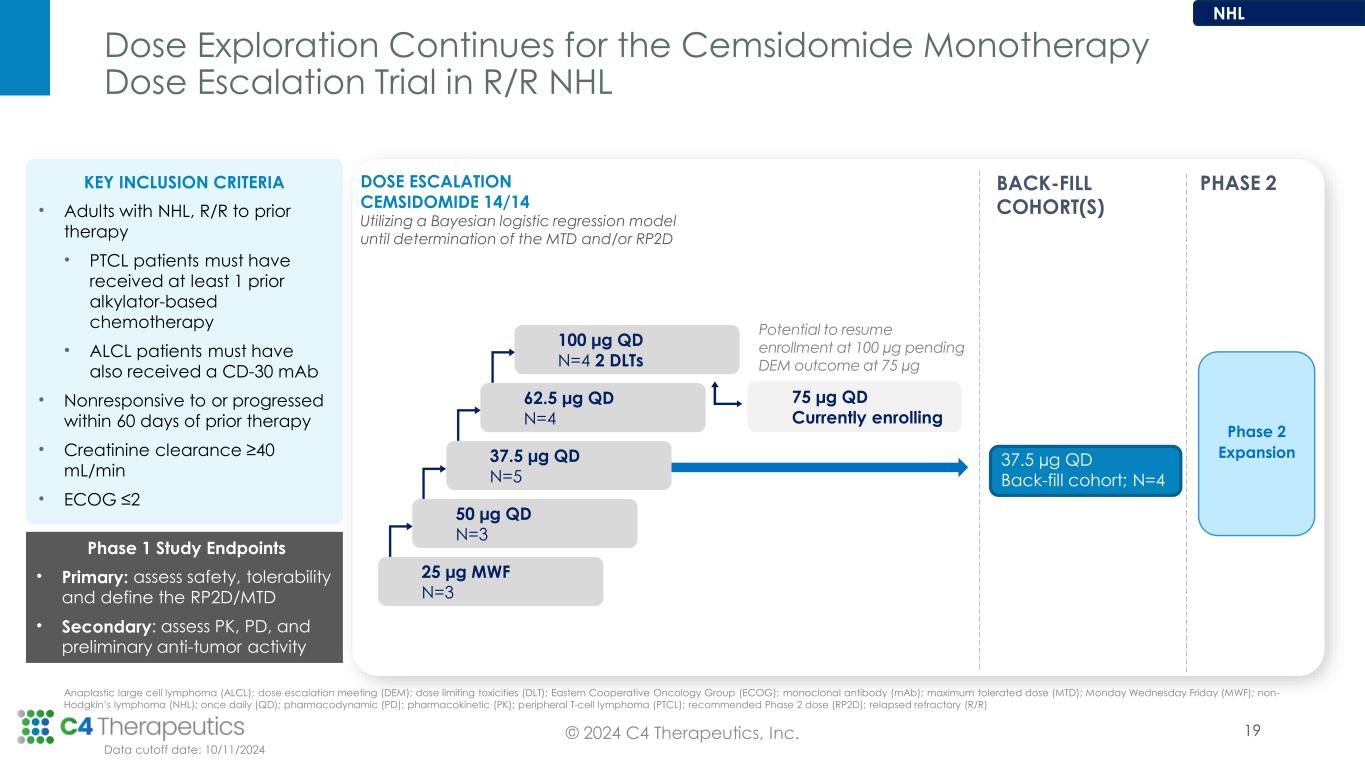 •At this time, the maximum tolerated dose has not been defined. Two dose-limiting toxicities occurred at the 100 µg QD dose level. As a result, a 75 µg QD cohort was opened to refine the understanding of dose and safety in the NHL population; this cohort is currently enrolling patients. Escalation above 75 µg QD may be explored pending the outcome of the cohort.