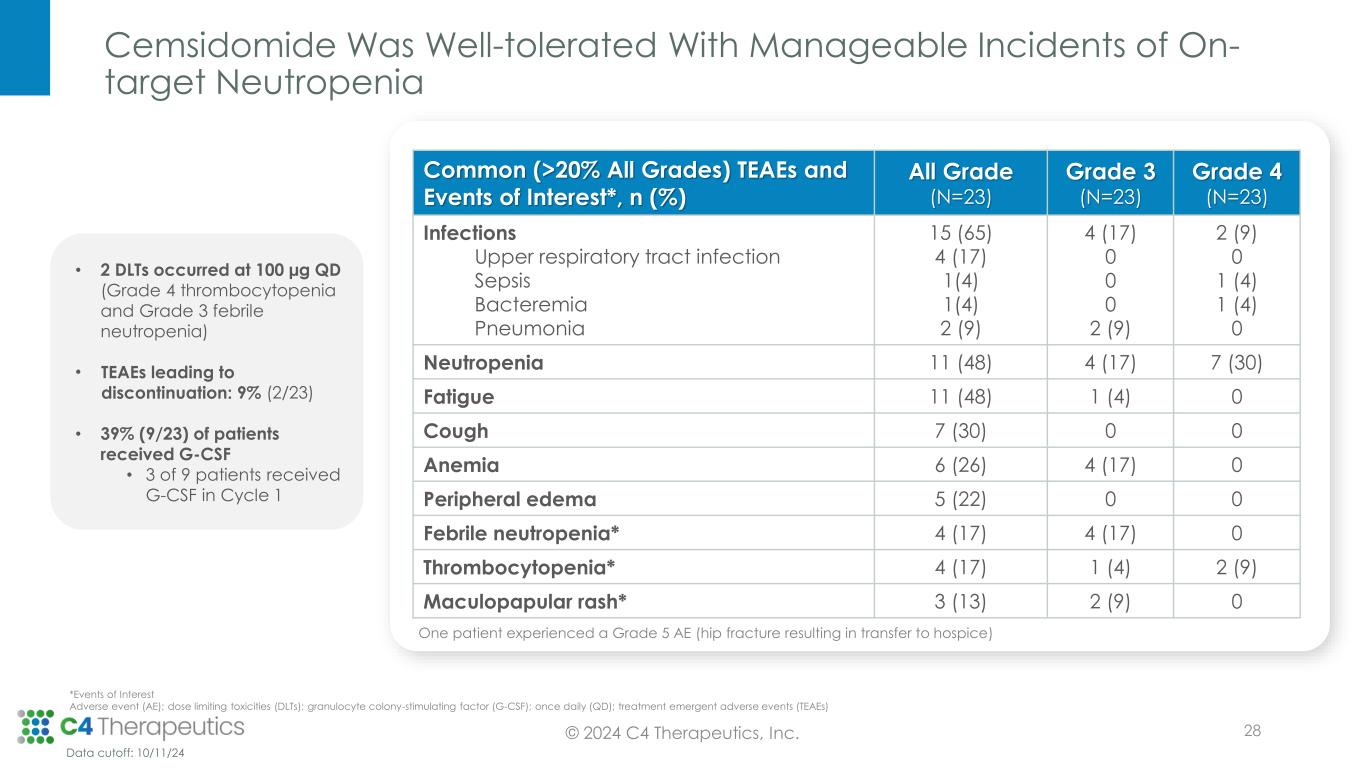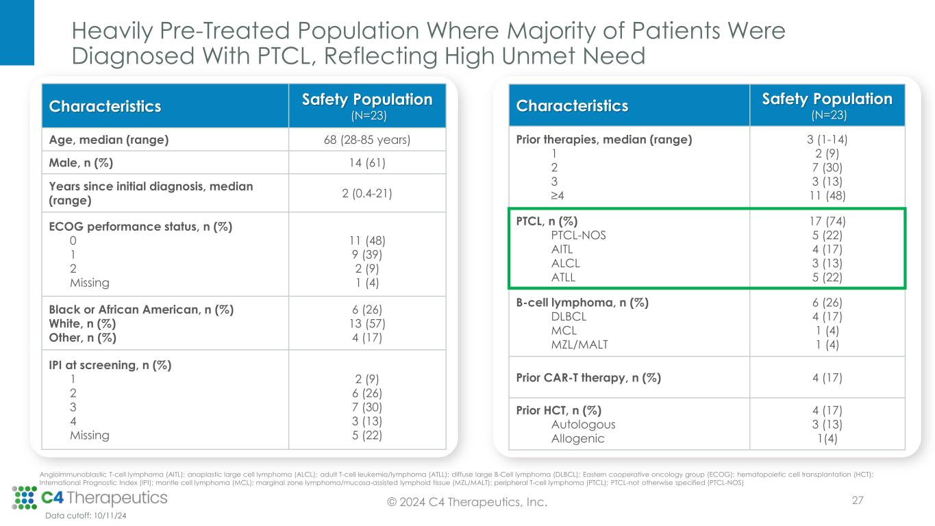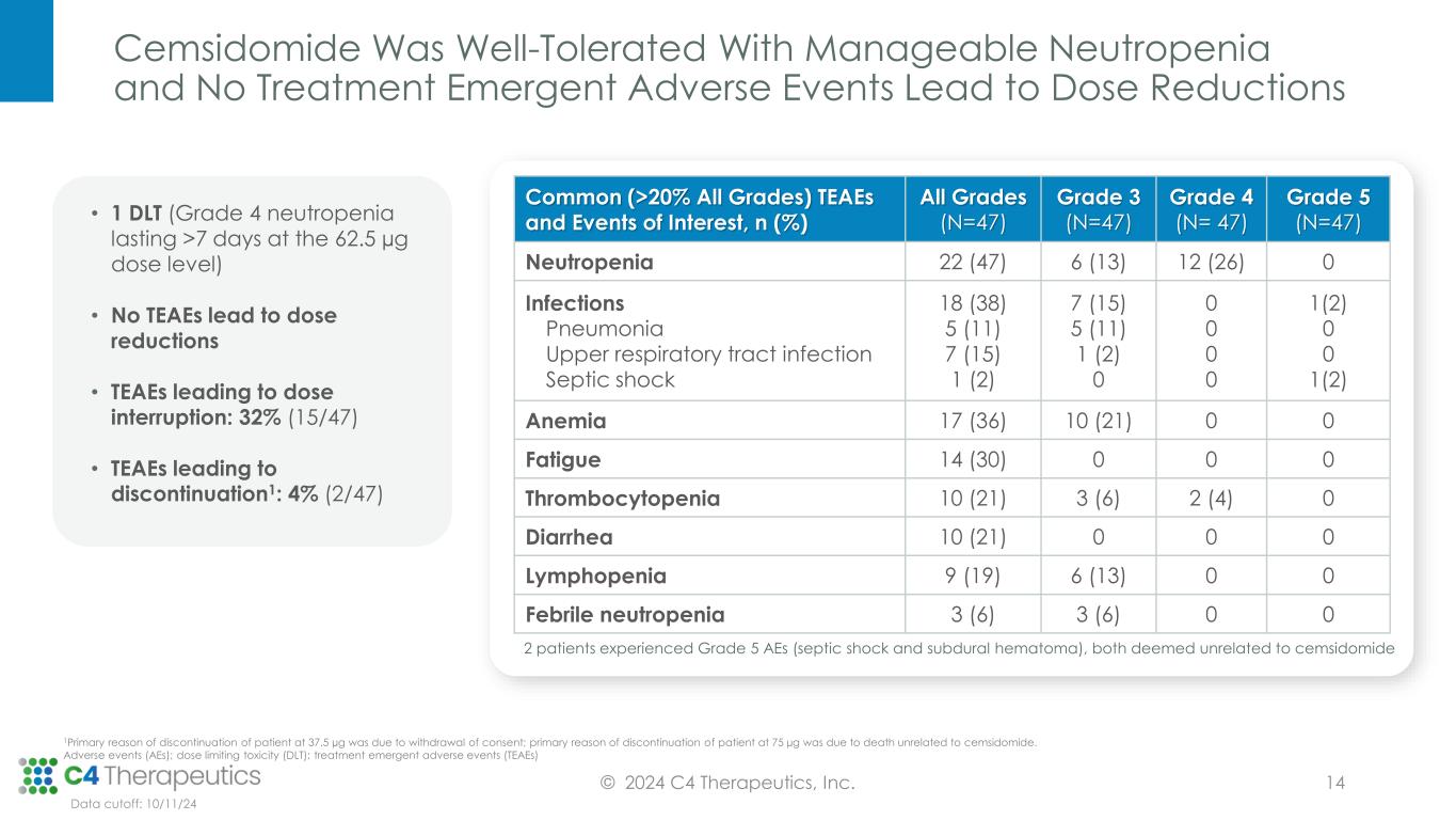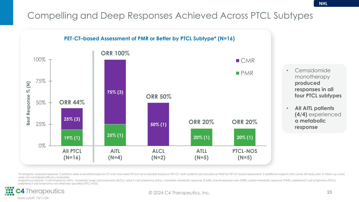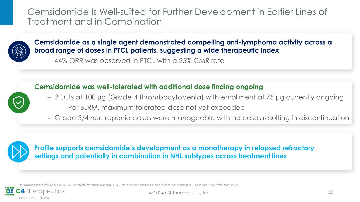 At the ASH Annual Meeting, C4T also presented safety and anti-lymphoma data that reinforce C4T’s belief that IKZF1/3 degradation remains relevant in lymphoma. Based on the emerging anti-lymphoma signal demonstrated in patients with PTCL, C4T believes cemsidomide could be further developed in areas of high unmet need.