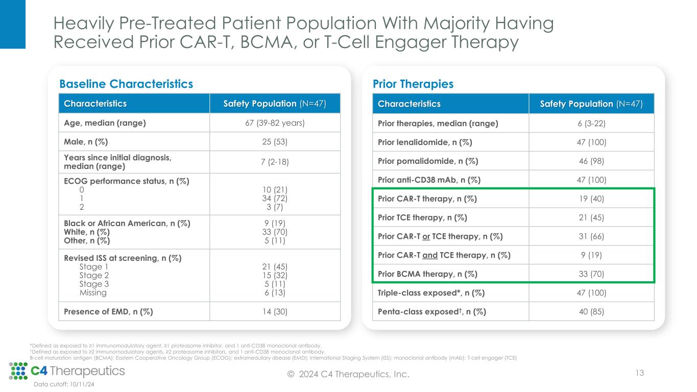 As of the data cutoff date of October 11, 2024, a total of 47 patients received cemsidomide in combination with dexamethasone across four dose levels (50 µg dosed Monday, Wednesday, Friday (MWF); 37.5 µg dosed once daily (QD); 62.5 µg QD; 75 µg QD). Patients were heavily pretreated, receiving a median of six prior therapies. All patients (100 percent) were triple-class exposed, defined as exposure to one or more immunomodulatory agents, one or more proteasome inhibitors, and one anti-CD38 antibody. Thirty-three patients (70 percent) received prior BCMA directed therapy. Thirty-one patients (66 percent) received prior CAR-T or T-cell engager therapy.