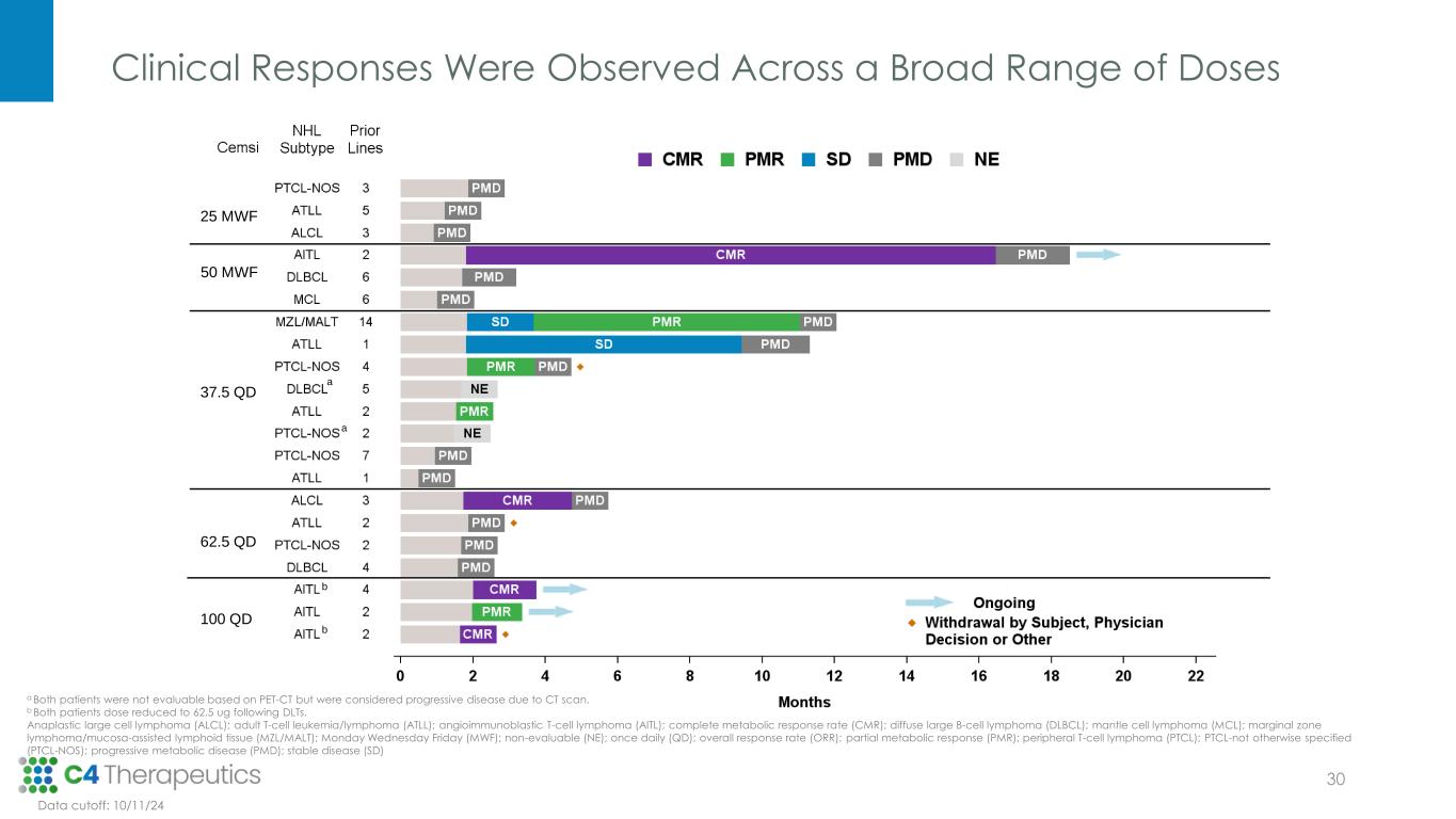 As of the data cutoff date of October 11, 2024, a total of 23 patients received cemsidomide monotherapy across five dose levels (25 µg MWF; 50 µg MWF QD; 37.5 µg QD; 62.5 µg QD; 100 µg QD). Patients were heavily pretreated, receiving a median of three prior therapies. Seventeen patients had refractory progressive PTCL and six patients had refractory progressive B-cell lymphoma.