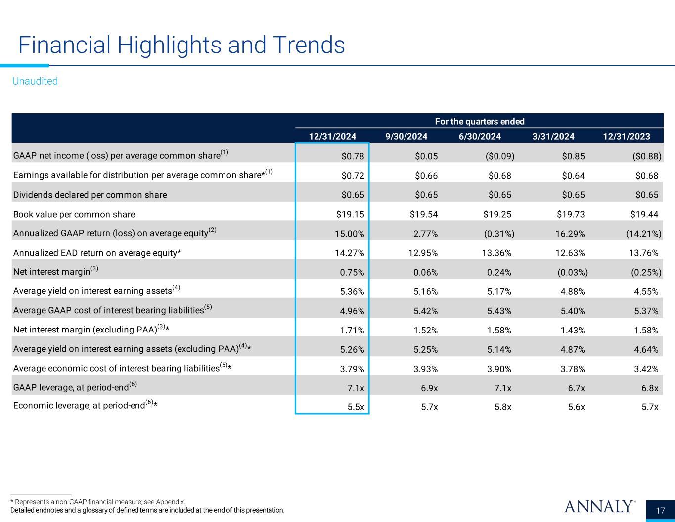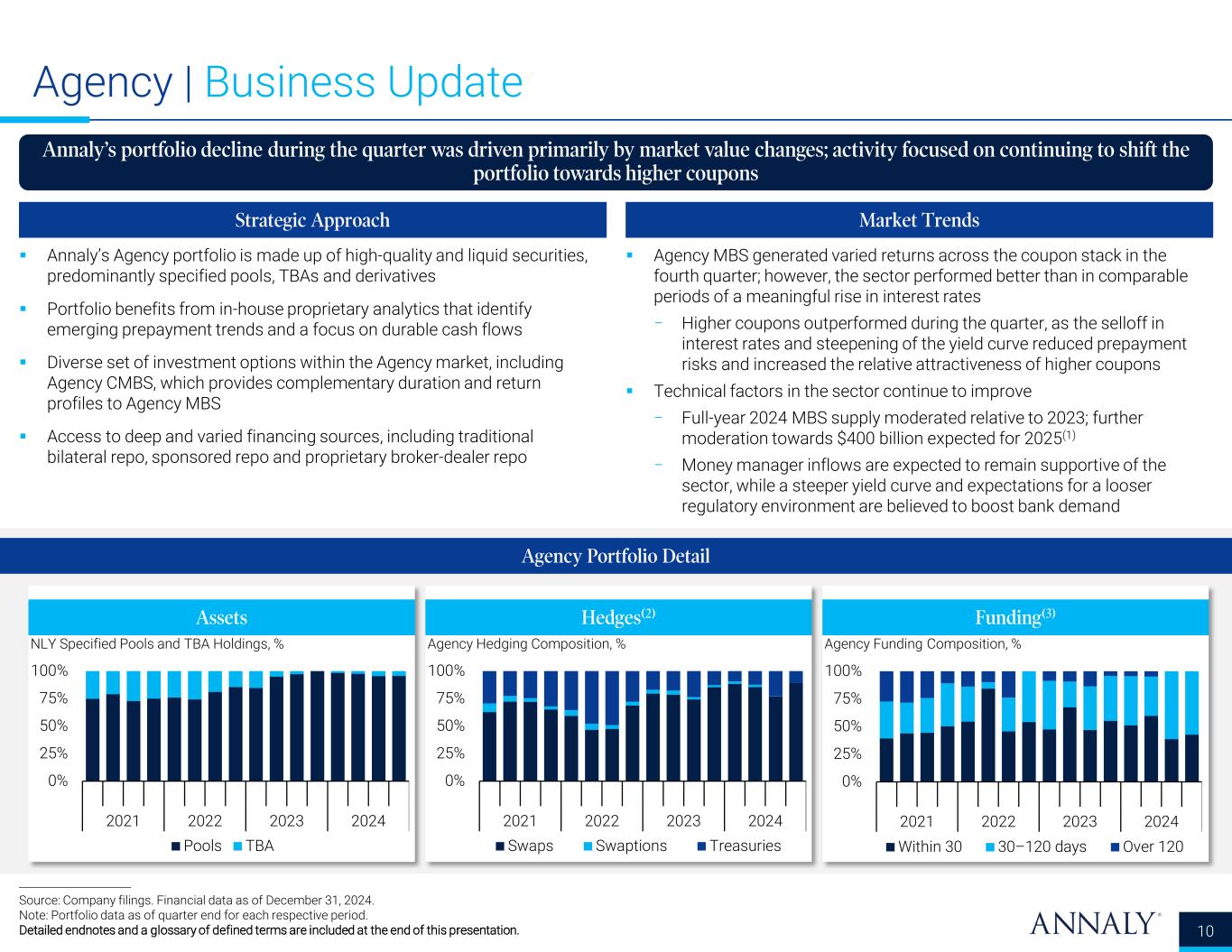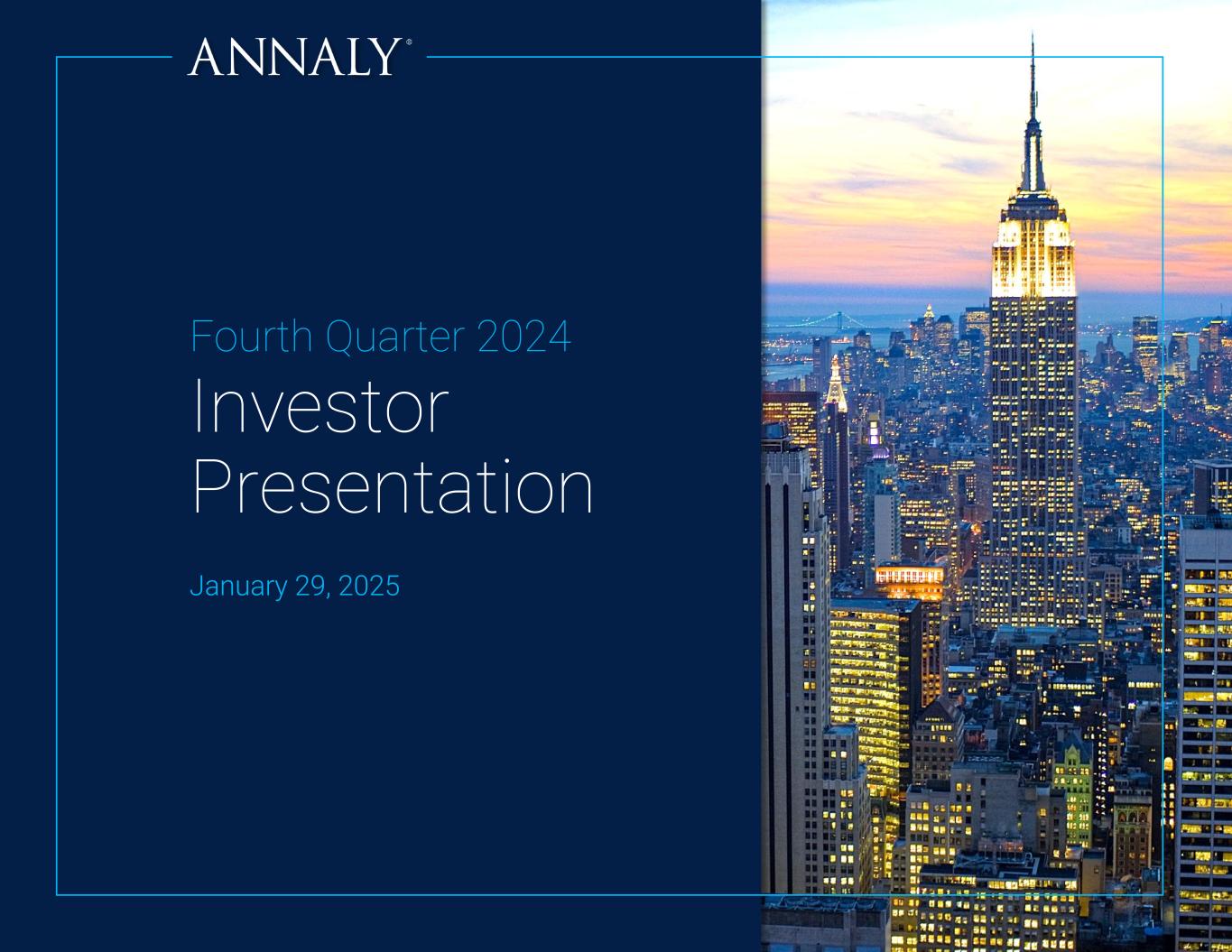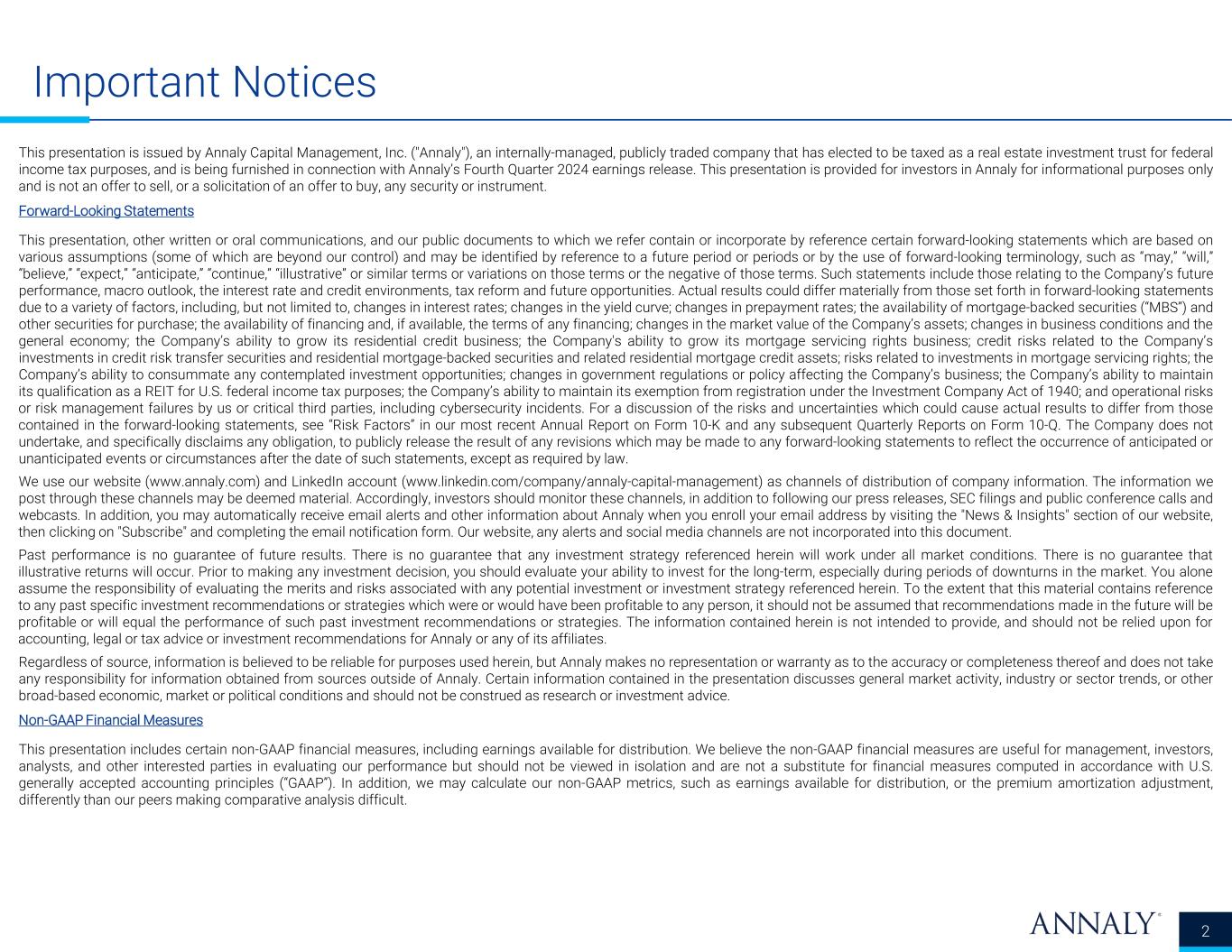 Important Notices 2 This presentation is issued by Annaly Capital Management, Inc. ("Annaly"), an internally-managed, publicly traded company that has elected to be taxed as a real estate investment trust for federal income tax purposes, and is being furnished in connection with Annaly’s Fourth Quarter 2024 earnings release. This presentation is provided for investors in Annaly for informational purposes only and is not an offer to sell, or a solicitation of an offer to buy, any security or instrument. Forward-Looking Statements This presentation, other written or oral communications, and our public documents to which we refer contain or incorporate by reference certain forward-looking statements which are based on various assumptions (some of which are beyond our control) and may be identified by reference to a future period or periods or by the use of forward-looking terminology, such as “may,” “will,” “believe,” “expect,” “anticipate,” “continue,” “illustrative” or similar terms or variations on those terms or the negative of those terms. Such statements include those relating to the Company’s future performance, macro outlook, the interest rate and credit environments, tax reform and future opportunities. Actual results could differ materially from those set forth in forward-looking statements due to a variety of factors, including, but not limited to, changes in interest rates; changes in the yield curve; changes in prepayment rates; the availability of mortgage-backed securities (“MBS”) and other securities for purchase; the availability of financing and, if available, the terms of any financing; changes in the market value of the Company’s assets; changes in business conditions and the general economy; the Company’s ability to grow its residential credit business; the Company's ability to grow its mortgage servicing rights business; credit risks related to the Company’s investments in credit risk transfer securities and residential mortgage-backed securities and related residential mortgage credit assets; risks related to investments in mortgage servicing rights; the Company’s ability to consummate any contemplated investment opportunities; changes in government regulations or policy affecting the Company’s business; the Company’s ability to maintain its qualification as a REIT for U.S. federal income tax purposes; the Company’s ability to maintain its exemption from registration under the Investment Company Act of 1940; and operational risks or risk management failures by us or critical third parties, including cybersecurity incidents. For a discussion of the risks and uncertainties which could cause actual results to differ from those contained in the forward-looking statements, see “Risk Factors” in our most recent Annual Report on Form 10-K and any subsequent Quarterly Reports on Form 10-Q. The Company does not undertake, and specifically disclaims any obligation, to publicly release the result of any revisions which may be made to any forward-looking statements to reflect the occurrence of anticipated or unanticipated events or circumstances after the date of such statements, except as required by law. We use our website (www.annaly.com) and LinkedIn account (www.linkedin.com/company/annaly-capital-management) as channels of distribution of company information. The information we post through these channels may be deemed material. Accordingly, investors should monitor these channels, in addition to following our press releases, SEC filings and public conference calls and webcasts. In addition, you may automatically receive email alerts and other information about Annaly when you enroll your email address by visiting the "News & Insights" section of our website, then clicking on "Subscribe" and completing the email notification form. Our website, any alerts and social media channels are not incorporated into this document. Past performance is no guarantee of future results. There is no guarantee that any investment strategy referenced herein will work under all market conditions. There is no guarantee that illustrative returns will occur. Prior to making any investment decision, you should evaluate your ability to invest for the long-term, especially during periods of downturns in the market. You alone assume the responsibility of evaluating the merits and risks associated with any potential investment or investment strategy referenced herein. To the extent that this material contains reference to any past specific investment recommendations or strategies which were or would have been profitable to any person, it should not be assumed that recommendations made in the future will be profitable or will equal the performance of such past investment recommendations or strategies. The information contained herein is not intended to provide, and should not be relied upon for accounting, legal or tax advice or investment recommendations for Annaly or any of its affiliates. Regardless of source, information is believed to be reliable for purposes used herein, but Annaly makes no representation or warranty as to the accuracy or completeness thereof and does not take any responsibility for information obtained from sources outside of Annaly. Certain information contained in the presentation discusses general market activity, industry or sector trends, or other broad-based economic, market or political conditions and should not be construed as research or investment advice. Non-GAAP Financial Measures This presentation includes certain non-GAAP financial measures, including earnings available for distribution. We believe the non-GAAP financial measures are useful for management, investors, analysts, and other interested parties in evaluating our performance but should not be viewed in isolation and are not a substitute for financial measures computed in accordance with U.S. generally accepted accounting principles (“GAAP”). In add