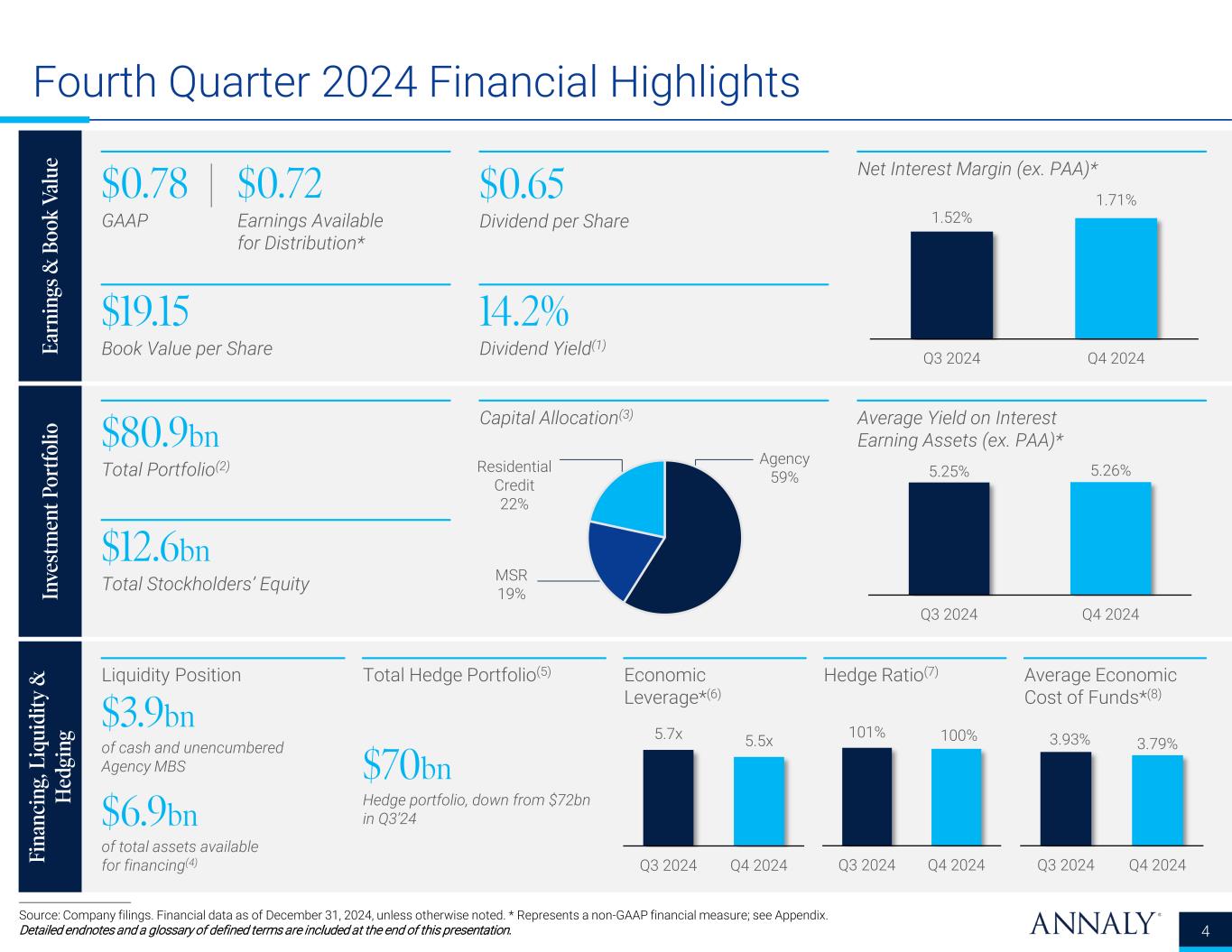 Recent Achievements and Performance Highlights Source: Company filings. Financial data as of December 31, 2024, unless otherwise noted. * Represents a non-GAAP financial measure; see Appendix. Detailed endnotes and a glossary of defined terms are included at the end of this presentation. Financial Performance Annaly generated a ~12% economic return for the year with earnings available for distribution in excess of the dividend Earnings available for distribution* of $0.72 per average common share for the quarter Book value per common share of $19.15 Declared quarterly common stock cash dividend of $0.65 per share Economic return of 1.3% for the fourth quarter and 11.9% for the full year 2024 Financing, Capital & Liquidity Annaly maintained its prudent leverage and liquidity position while declining financing costs supported its earnings profile Economic leverage* of 5.5x, down from 5.7x in the third quarter $6.9 billion of total assets available for financing(1), including cash and unencumbered Agency MBS of $3.9 billion Annaly Residential Credit Group remains the largest non-bank issuer and the second largest issuer overall(2) of Prime Jumbo and Expanded Credit MBS, pricing 21 residential whole loan securitizations totaling $11.0 billion in proceeds in 2024 Since the beginning of 2024, Annaly’s Residential Credit and MSR businesses increased financing capacity by $1.3 billion and $550 million, respectively, through new and expanded credit facilities; total warehouse capacity across both businesses of $5.4 billion, including $2.2 billion of committed capacity(3) Financing costs decreased quarter-over-quarter with average GAAP cost of interest-bearing liabilities of 4.96%, down 46 basis points quarter-over-quarter, and average economic cost of interest-bearing liabilities* of 3.79%, down 14 basis points quarter-over-quarter Raised $1.6 billion of accretive common equity through the Company’s at-the-market sales program in 2024(4) Portfolio Performance Annaly’s diversified housing finance model achieved strong results in 2024 across each of its investment strategies Total portfolio of $80.9 billion, including $70.6 billion in highly liquid Agency MBS strategy, which represents 87% of total assets(5) and 59% of dedicated capital During the quarter, Annaly’s Agency portfolio decreased modestly with portfolio activity focused on rotating further into higher coupons; the Agency portfolio increased 7% year-over-year Annaly’s Residential Credit portfolio increased to $7.0 billion(5), representing a 17% increase year-over-year due to the record growth of the correspondent channel in 2024 – During 2024, the correspondent channel achieved $17.6 billion in lock volume, with total funded volume of $11.7 billion; the fourth quarter represented the sixth and fifth consecutive record-breaking quarter for lock volume and fundings, respectively Annaly’s MSR portfolio increased 24% year-over-year to $3.3 billion(5) in market value, now representing 19% of dedicated capital 3