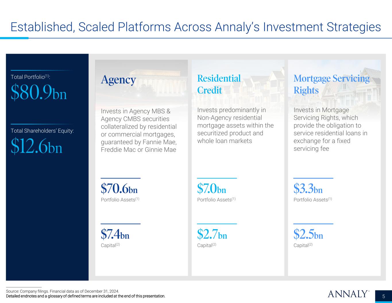Fourth Quarter 2024 Financial Highlights Ea rn in gs & B oo k Va lu e In ve st m en t P or tf ol io Fi na nc in g, L iq ui di ty & H ed gi ng $0.78 | GAAP $0.72 Earnings Available for Distribution* $19.15 Book Value per Share 14.2% Dividend Yield(1) $0.65 Dividend per Share Net Interest Margin (ex. PAA)* $80.9bn Total Portfolio(2) $12.6bn Total Stockholders’ Equity Capital Allocation(3) Average Yield on Interest Earning Assets (ex. PAA)* Liquidity Position $3.9bn of cash and unencumbered Agency MBS $6.9bn of total assets available for financing(4) Total Hedge Portfolio(5) $70bn Hedge portfolio, down from $72bn in Q3’24 Economic Leverage*(6) Hedge Ratio(7) Average Economic Cost of Funds*(8) Source: Company filings. Financial data as of December 31, 2024, unless otherwise noted. * Represents a non-GAAP financial measure; see Appendix. Detailed endnotes and a glossary of defined terms are included at the end of this presentation. 4 Agency 59% MSR 19% Residential Credit 22% 5.25% 5.26% Q3 2024 Q4 2024 5.7x 5.5x Q3 2024 Q4 2024 101% 100% Q3 2024 Q4 2024 3.93% 3.79% Q3 2024 Q4 2024 1.52% 1.71% Q3 2024 Q4 2024