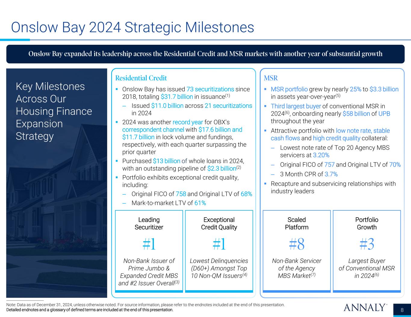 MSRResidential CreditAgency Key Market Dynamics & Commentary Current Illustrative Market Levered Returns(1) Illustrative Returns & Market Dynamics Across Annaly's Investment Strategies Source: Company filings. Financial data as of December 31, 2024. Market data as of January 24, 2025, unless otherwise noted. Detailed endnotes and a glossary of defined terms are included at the end of this presentation. The current favorable environment for Agency MBS has resulted from factors including: – Spread levels remaining attractive – Steeper yield curve and decreasing financing costs improving carry – Supply/demand moving into balance with reduced origination and stable demand from money mangers and banks Prepayment risk remains muted Volatility remains above historical averages Home prices are holding firm, up 2.6% year-over- year(2), with continued regional disparities in HPA Residential credit spreads tightened modestly throughout the quarter, providing a supportive backdrop for securitization issuers 2024 Non-Agency gross issuance increased 83% year-over-year(3) driven by growth in Prime Jumbo and Non-QM securitizations 2025 Non-Agency issuance expected to grow ~20%+ driven by strong Non-QM demand, as well as growth in other products including 2nd Lien / HELOC and Jumbo loans(3) Strong fundamental asset performance has supported MSR returns, including: – Low prepayments – Muted delinquencies – Predictable servicing costs – High levels of float income MSR valuations increased modestly, driven primarily by interest rate increases Bulk supply has been episodic; however, industry consolidation expected to persist as origination activity remains challenged 15%–17% 12%–15% 12%–14% Top 10 non-bank Agency MBS servicer with the lowest note rate among top 20 servicers(4) High quality MSR with exceptional credit quality – 757 weighted average FICO and 70% LTV ratio at origination Continue to build out flow purchase capabilities and well-positioned for bulk acquisitions given complementary buyer to originators/servicers Recapture and subservicing relationships with industry leaders Correspondent channel saw record whole loan production throughout 2024 without sacrificing portfolio credit quality – Locked pipeline represents a 757 weighted average FICO and 68% LTV ratio at origination OBX is one of the largest and most liquid sponsors of residential credit securitizations, representing nearly 25% of Non-QM issuance and nearly 10% of total gross Non-Agency issuance in 2024(3) Whole loans and retained OBX securities continue to be preferred avenue for growth relative to third- party securities Over the last few quarters, programmatically migrated up in coupon in high quality specified pools – More recently, relative value has shifted to medium quality specified pools and TBAs Maintained a prudent leverage position with substantial liquidity and a conservative hedge portfolio Agency CMBS remains accretive to overall portfolio returns while improving convexity Continued focus on proprietary modeling of the portfolio 7 Annaly’s Positioning