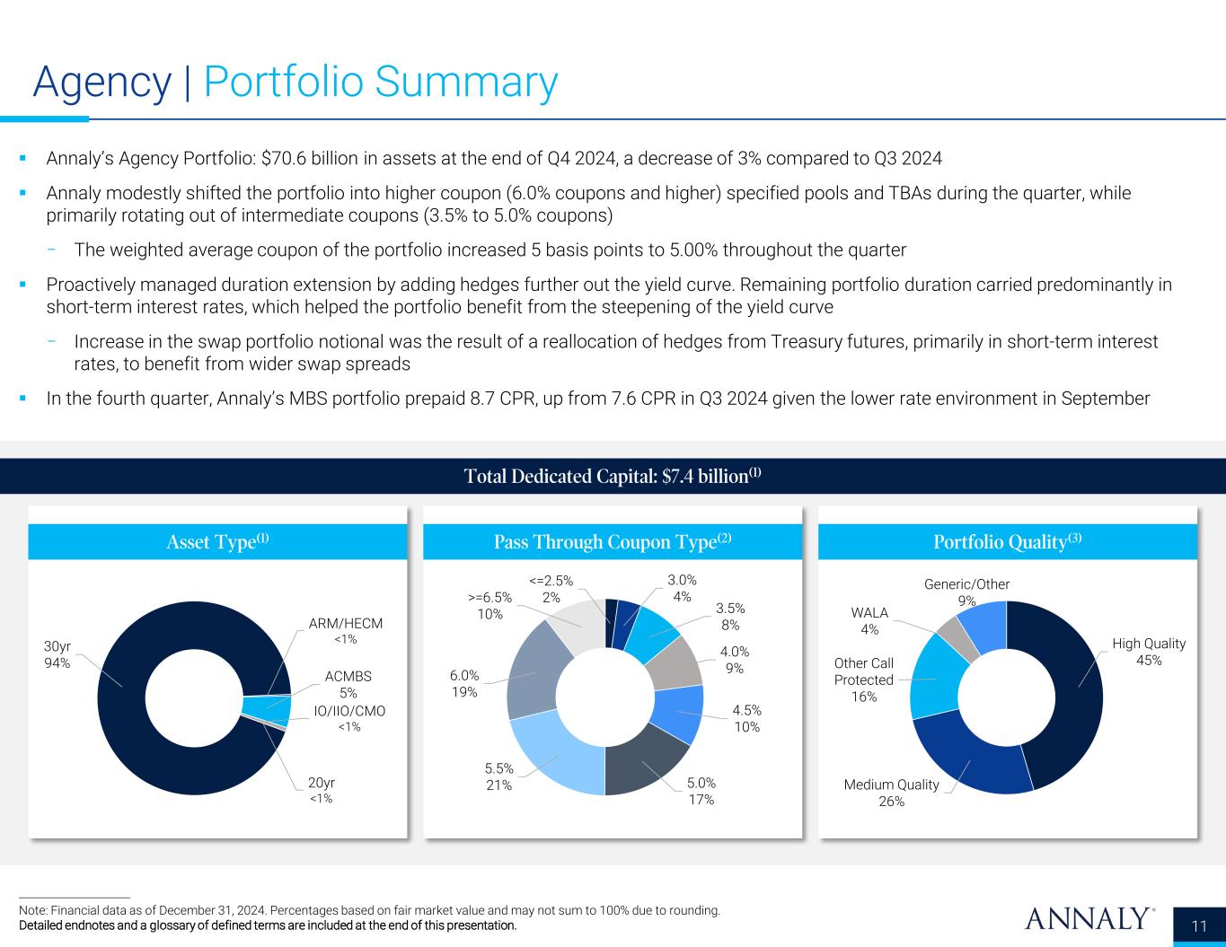 Annaly’s Agency portfolio is made up of high-quality and liquid securities, predominantly specified pools, TBAs and derivatives Portfolio benefits from in-house proprietary analytics that identify emerging prepayment trends and a focus on durable cash flows Diverse set of investment options within the Agency market, including Agency CMBS, which provides complementary duration and return profiles to Agency MBS Access to deep and varied financing sources, including traditional bilateral repo, sponsored repo and proprietary broker-dealer repo Agency | Business Update Annaly’s portfolio decline during the quarter was driven primarily by market value changes; activity focused on continuing to shift the portfolio towards higher coupons 10 Source: Company filings. Financial data as of December 31, 2024. Note: Portfolio data as of quarter end for each respective period. Detailed endnotes and a glossary of defined terms are included at the end of this presentation. Agency Portfolio Detail Assets Hedges(2) Funding(3) Strategic Approach Agency MBS generated varied returns across the coupon stack in the fourth quarter; however, the sector performed better than in comparable periods of a meaningful rise in interest rates − Higher coupons outperformed during the quarter, as the selloff in interest rates and steepening of the yield curve reduced prepayment risks and increased the relative attractiveness of higher coupons Technical factors in the sector continue to improve − Full-year 2024 MBS supply moderated relative to 2023; further moderation towards $400 billion expected for 2025(1) − Money manager inflows are expected to remain supportive of the sector, while a steeper yield curve and expectations for a looser regulatory environment are believed to boost bank demand Market Trends 0% 25% 50% 75% 100% 2021 2022 2023 2024 Within 30 30–120 days Over 120 Agency Funding Composition, % 0% 25% 50% 75% 100% 2021 2022 2023 2024 Swaps Swaptions Treasuries Agency Hedging Composition, % 0% 25% 50% 75% 100% 2021 2022 2023 2024 Pools TBA NLY Specified Pools and TBA Holdings, %