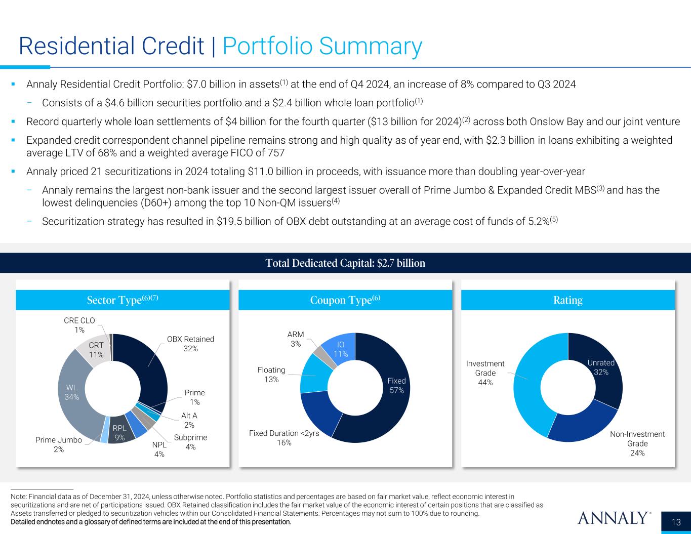 Residential Credit | Business Update Annaly’s Residential Credit portfolio continued to benefit from the significant and growing presence of the Onslow Bay correspondent channel in the expanded credit whole loan market 12Source: Company filings. Financial data as of December 31, 2024. Detailed endnotes and a glossary of defined terms are included at the end of this presentation. Programmatic securitization sponsor of new origination, residential whole loans with 73 deals comprising $31.7 billion of issuance since the beginning of 2018(1) Agile platform that can deploy capital across both the residential whole loan and Non-Agency securities markets Whole loan acquisition via Onslow Bay correspondent channel and securitization program provides the ability to create proprietary investments tailored to desired credit preferences with control over asset selection, counterparties and loss mitigation Modest use of long-term balance sheet leverage with most positions term financed through securitization Strategic Approach Non-Agency RMBS spreads tightened modestly throughout the quarter − Non-QM AAA spreads ended the quarter 10-15 basis points tighter, with CRT M2 spreads 15-20 basis points tighter The Zillow Home Price Index was up 0.2% month-over-month in December, and up 2.6% year-over-year(2) − Onslow Bay GAAP whole loan portfolio mark-to-market LTV of 61% compared to 68% original LTV Non-QM delinquencies continued to trend modestly higher, driving further differentiation between issuers − Onslow Bay has the lowest delinquencies (D60+) among the top 10 Non-QM issuers(3) Market and Credit Trends OBX Securitization History – UPB Issued ($mm)(1)Correspondent Channel Quarterly Lock and Funded Volumes ($mm) 3 5 4 10 16 13 21 Number of Deals $2,752 $2,823 $3,159 $2,271 $1,094 $2,095 $1,846 $3,857 $6,196 $4,941 $11,005 2018 2019 2020 2021 2022 2023 2024 Q1'24: Q2'24: Q3'24: Q4'24:$3,742 $4,091 $4,369 $5,397 $2,266 $2,767 $2,889 $3,815 Q1 2024 Q2 2024 Q3 2024 Q4 2024 Locks Fundings