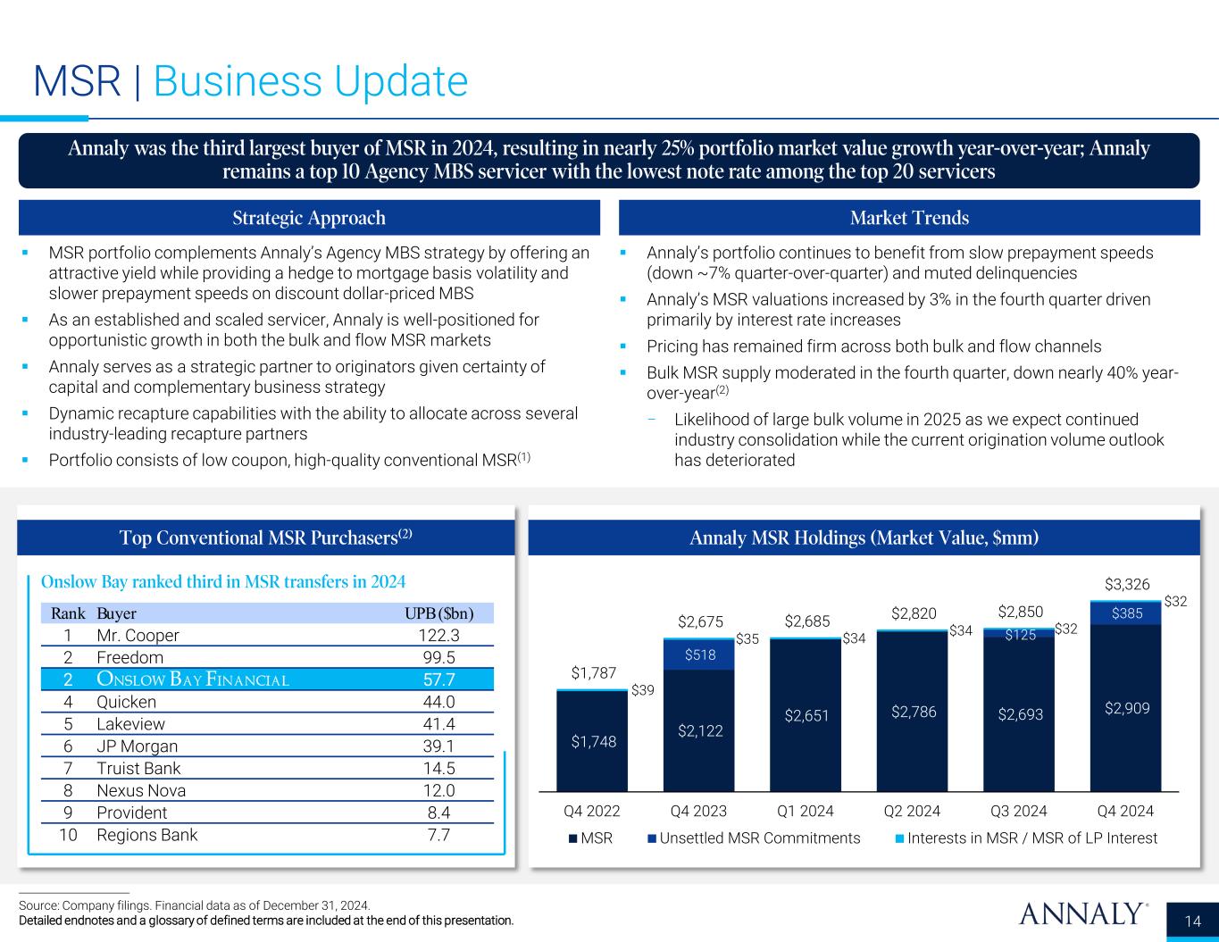 Residential Credit | Portfolio Summary Annaly Residential Credit Portfolio: $7.0 billion in assets(1) at the end of Q4 2024, an increase of 8% compared to Q3 2024 − Consists of a $4.6 billion securities portfolio and a $2.4 billion whole loan portfolio(1) Record quarterly whole loan settlements of $4 billion for the fourth quarter ($13 billion for 2024)(2) across both Onslow Bay and our joint venture Expanded credit correspondent channel pipeline remains strong and high quality as of year end, with $2.3 billion in loans exhibiting a weighted average LTV of 68% and a weighted average FICO of 757 Annaly priced 21 securitizations in 2024 totaling $11.0 billion in proceeds, with issuance more than doubling year-over-year − Annaly remains the largest non-bank issuer and the second largest issuer overall of Prime Jumbo & Expanded Credit MBS(3) and has the lowest delinquencies (D60+) among the top 10 Non-QM issuers(4) − Securitization strategy has resulted in $19.5 billion of OBX debt outstanding at an average cost of funds of 5.2%(5) 13 Note: Financial data as of December 31, 2024, unless otherwise noted. Portfolio statistics and percentages are based on fair market value, reflect economic interest in securitizations and are net of participations issued. OBX Retained classification includes the fair market value of the economic interest of certain positions that are classified as Assets transferred or pledged to securitization vehicles within our Consolidated Financial Statements. Percentages may not sum to 100% due to rounding. Detailed endnotes and a glossary of defined terms are included at the end of this presentation. Total Dedicated Capital: $2.7 billion Sector Type(6)(7) Coupon Type(6) Rating OBX Retained 32% Prime 1% Alt A 2% Subprime 4%NPL 4% RPL 9%Prime Jumbo 2% WL 34% CRT 11% CRE CLO 1% Fixed 57% Fixed Duration <2yrs 16% Floating 13% ARM 3% IO 11% Unrated 32% Non-Investment Grade 24% Investment Grade 44%