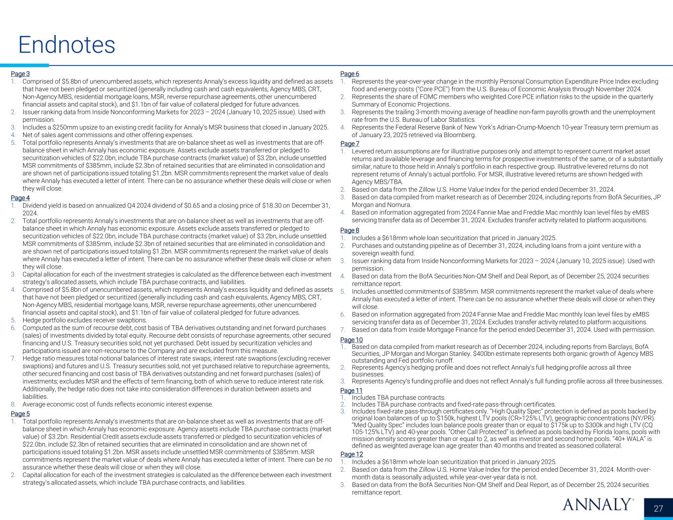 Endnotes 27 Page 3 1. Comprised of $5.8bn of unencumbered assets, which represents Annaly’s excess liquidity and defined as assets that have not been pledged or securitized (generally including cash and cash equivalents, Agency MBS, CRT, Non-Agency MBS, residential mortgage loans, MSR, reverse repurchase agreements, other unencumbered financial assets and capital stock), and $1.1bn of fair value of collateral pledged for future advances. 2. Issuer ranking data from Inside Nonconforming Markets for 2023 – 2024 (January 10, 2025 issue). Used with permission. 3. Includes a $250mm upsize to an existing credit facility for Annaly’s MSR business that closed in January 2025. 4. Net of sales agent commissions and other offering expenses. 5. Total portfolio represents Annaly’s investments that are on-balance sheet as well as investments that are off- balance sheet in which Annaly has economic exposure. Assets exclude assets transferred or pledged to securitization vehicles of $22.0bn, include TBA purchase contracts (market value) of $3.2bn, include unsettled MSR commitments of $385mm, include $2.3bn of retained securities that are eliminated in consolidation and are shown net of participations issued totaling $1.2bn. MSR commitments represent the market value of deals where Annaly has executed a letter of intent. There can be no assurance whether these deals will close or when they will close. Page 4 1. Dividend yield is based on annualized Q4 2024 dividend of $0.65 and a closing price of $18.30 on December 31, 2024. 2. Total portfolio represents Annaly’s investments that are on-balance sheet as well as investments that are off- balance sheet in which Annaly has economic exposure. Assets exclude assets transferred or pledged to securitization vehicles of $22.0bn, include TBA purchase contracts (market value) of $3.2bn, include unsettled MSR commitments of $385mm, include $2.3bn of retained securities that are eliminated in consolidation and are shown net of participations issued totaling $1.2bn. MSR commitments represent the market value of deals where Annaly has executed a letter of intent. There can be no assurance whether these deals will close or when they will close. 3. Capital allocation for each of the investment strategies is calculated as the difference between each investment strategy’s allocated assets, which include TBA purchase contracts, and liabilities. 4. Comprised of $5.8bn of unencumbered assets, which represents Annaly’s excess liquidity and defined as assets that have not been pledged or securitized (generally including cash and cash equivalents, Agency MBS, CRT, Non-Agency MBS, residential mortgage loans, MSR, reverse repurchase agreements, other unencumbered financial assets and capital stock), and $1.1bn of fair value of collateral pledged for future advances. 5. Hedge portfolio excludes receiver swaptions. 6. Computed as the sum of recourse debt, cost basis of TBA derivatives outstanding and net forward purchases (sales) of investments divided by total equity. Recourse debt consists of repurchase agreements, other secured financing and U.S. Treasury securities sold, not yet purchased. Debt issued by securitization vehicles and participations issued are non-recourse to the Company and are excluded from this measure. 7. Hedge ratio measures total notional balances of interest rate swaps, interest rate swaptions (excluding receiver swaptions) and futures and U.S. Treasury securities sold, not yet purchased relative to repurchase agreements, other secured financing and cost basis of TBA derivatives outstanding and net forward purchases (sales) of investments; excludes MSR and the effects of term financing, both of which serve to reduce interest rate risk. Additionally, the hedge ratio does not take into consideration differences in duration between assets and liabilities. 8. Average economic cost of funds reflects economic interest expense. Page 5 1. Total portfolio represents Annaly’s investments that are on-balance sheet as well as investments that are off- balance sheet in which Annaly has economic exposure. Agency assets include TBA purchase contracts (market value) of $3.2bn. Residential Credit assets exclude assets transferred or pledged to securitization vehicles of $22.0bn, include $2.3bn of retained securities that are eliminated in consolidation and are shown net of participations issued totaling $1.2bn. MSR assets include unsettled MSR commitments of $385mm. MSR commitments represent the market value of deals where Annaly has executed a letter of intent. There can be no assurance whether these deals will close or when they will close. 2. Capital allocation for each of the investment strategies is calculated as the difference between each investment strategy’s allocated assets, which include TBA purchase contracts, and liabilities. Page 6 1. Represents the year-over-year change in the monthly Personal Consumption Expenditure Price Index excluding food and energy costs ("Core PCE") from the U.S. Bureau of Economic Analysis through November 2024. 2. Represents the share of FOMC members who weighted Core PCE inflation risks to the upside in the quarterly Summary of Economic Projections. 3. Represents the trailing 3-month moving average of headline non-farm payrolls growth and the unemployment rate from the U.S. Bureau of Labor Statistics. 4. Represents the Federal Reserve Bank of New York's Adrian-Crump-Moench 10-year Treasury term premium as of January 23, 2025 retrieved via Bloomberg. Page 7 1. Levered return assumptions are for illustrative purposes only and attempt to represent current market asset returns and available leverage and financing terms for prospective investments of the same, or of a substantially similar, nature to those held in Annaly’s portfolio in each respective group. Illustrative levered returns do not represent returns of Annaly’s actual portfolio. For MSR, illustrative levered returns are shown hedged with Agency MBS/TBA. 